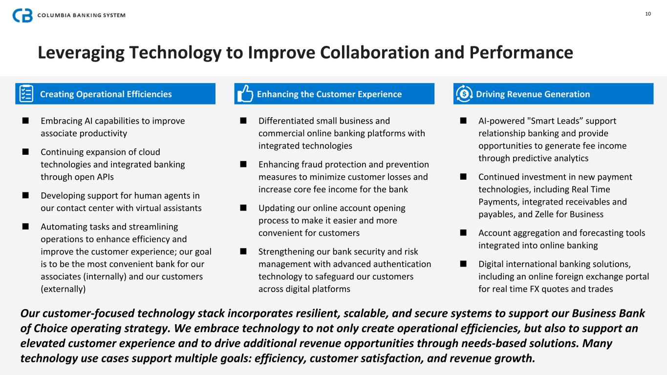收购具有战略吸引力和财务吸引力9交易概况(一)▪将哥伦比亚的南加州扩张战略加速约10年,并增强在新增长市场的影响力▪打造具有战略凝聚力的区域强国,资产规模约700亿美元▪新增HOA银行业务、托管信托业务、托管和1031交易所业务、API银行平台▪强大的企业契合度和相似的经营和信贷理念限制了执行风险战略理由具有财务吸引力(1)▪排名前十的同行备考盈利能力比率(例如ROATCE、ROAA、efficiency)意味着哥伦比亚的估值有上行空间▪截至2025年6月30日,Pacific Premier的总RBC比率为18.9%,CET1比率为17.0%,资本相对过剩▪14% 2026E EPS增值与初始有形账面价值摊薄三年收回(交叉法)▪按市值计价处理增强资产负债表重组灵活性▪100%普通股,无需为支持交易筹集资金▪固定汇率;Pacific Premier股东每持有一股Pacific Premier股票将获得0.9 150股Columbia股票▪预计最早将于2025年9月1日关闭,在收到监管批准和其他惯例成交条件的情况下▪合并后的组织将以哥伦比亚银行的统一品牌运营▪Columbia和Pacific Premier的股东在各自的特别会议上以压倒性多数通过了合并,会议于2025年7月21日举行▪在跨公司团队全面筹备的推动下,整合工作正按计划推进,这些团队由哥伦比亚的整合管理办公室牵头,一旦获得监管批准并满足其他惯例成交条件,我们就能够顺利、及时地完成交易。整合更新(1)有关备考财务假设和调整,请参见附录。