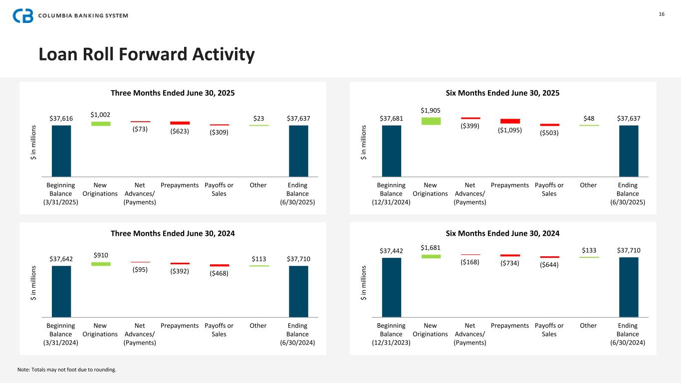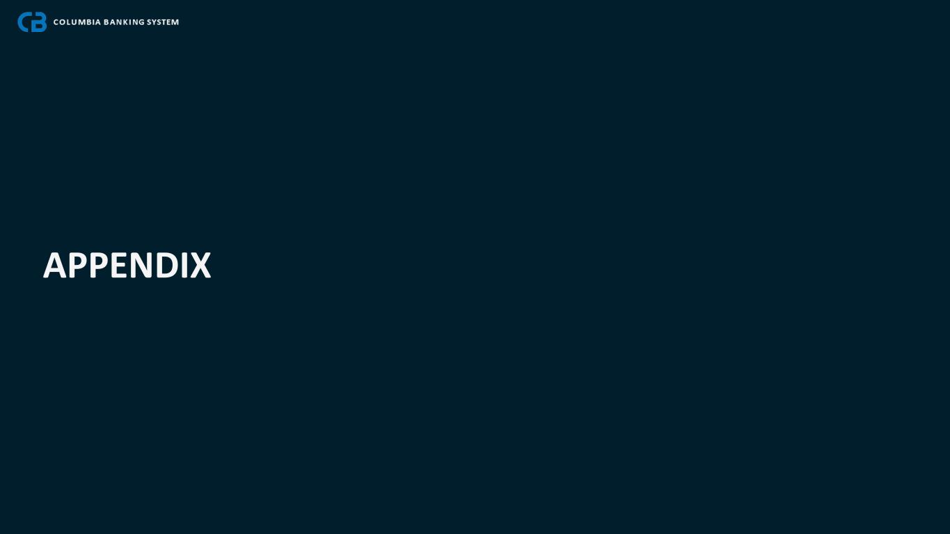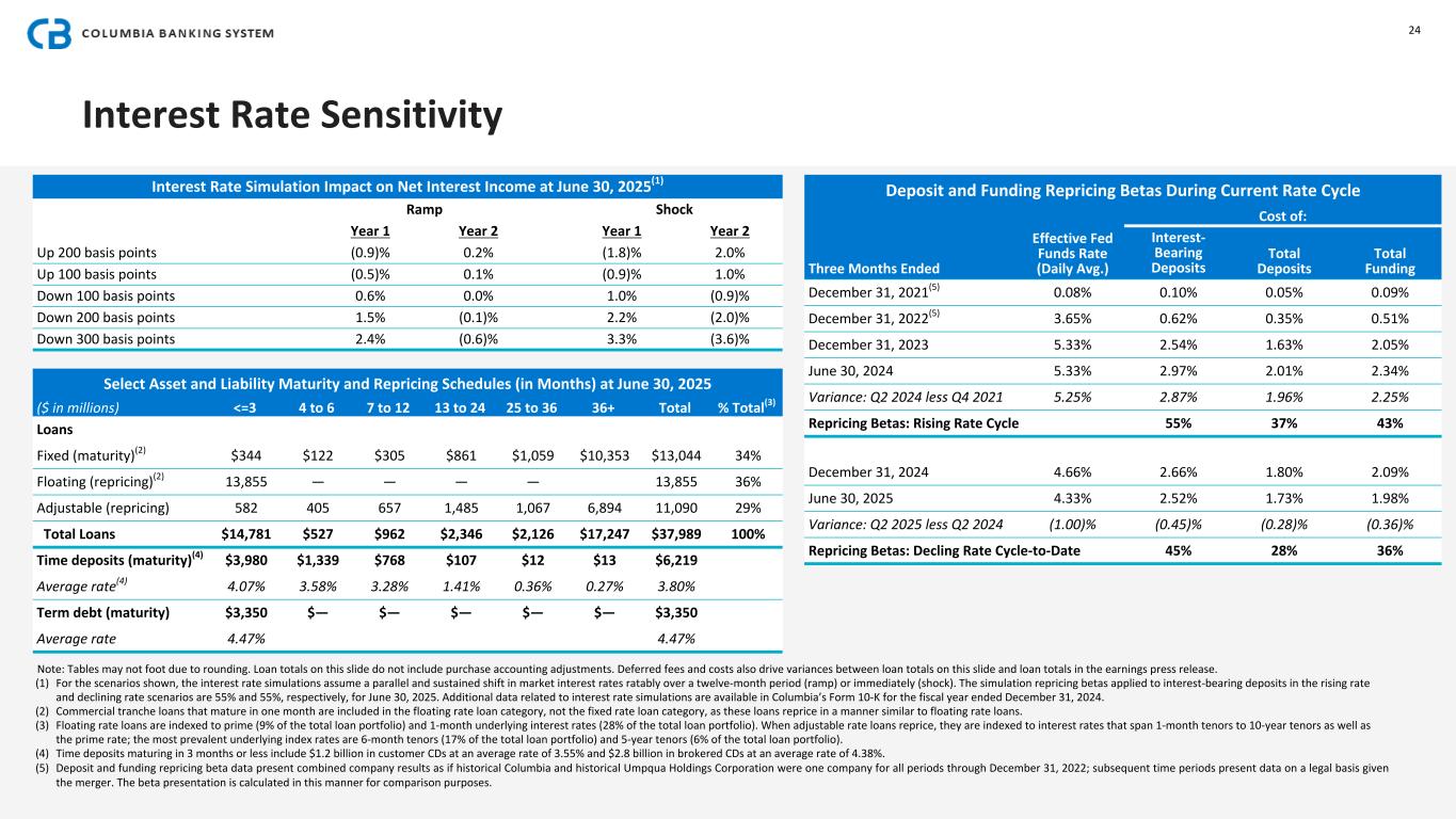 选择6月30日资产负债到期和重新定价时间表(以月为单位),2025年(百万美元)< = 34至67至1213至2425至3636 +合计%总额(3)贷款固定(到期)(2)344美元122美元305美元861美元1,059美元10,353美元13,04434%浮动(重新定价)(2)13,855 ———— 13,85536%可调整(重新定价)5824056571,4851,0676,89411,09029%贷款总额14,781美元527美元962美元2,346美元2,126美元17,247美元37,989100%定期存款(到期)(4)3,980美元1,339美元768美元107美元12美元13美元6,219平均利率(4)4.07% 3.58% 3.28% 1.41% 0.36% 0.27% 3.80%定期债务(到期)3,350美元— —由于四舍五入,可能无法站立。这张幻灯片上的贷款总额不包括采购会计调整。递延费用和成本也导致了这张幻灯片上的贷款总额与收益新闻稿中的贷款总额之间的差异。(1)对于所示的情景,利率模拟假设市场利率在12个月期间(斜坡)或立即(冲击)内平行且持续地按比例移动。2025年6月30日在利率上升和利率下降情景下应用于计息存款的模拟重定价贝塔系数分别为55%和55%。有关利率模拟的更多数据可在哥伦比亚截至2024年12月31日的财政年度的10-K表格中获得。(2)一个月内到期的商业部分贷款被纳入浮动利率贷款类别,而不是固定利率贷款类别,因为这些贷款以类似浮动利率贷款的方式重新定价。(3)浮动利率贷款与prime(占总贷款组合的9%)和1个月基础利率(占总贷款组合的28%)挂钩。当可调整利率贷款重新定价时,它们被指数化为跨越1个月期至10年期的利率以及最优惠利率;最普遍的基础指数利率是6个月期(占总贷款组合的17%)和5年期(占总贷款组合的6%)。(4)3个月及以下到期的定期存款包括平均利率为3.55%的12亿美元客户CD和平均利率为4.38%的28亿美元经纪CD。(5)存款和资金重定价beta数据呈现合并后的公司业绩,就好像历史上的Columbia和历史上的Umpqua Holdings Corporation在截至2022年12月31日的所有期间是一家公司一样;随后的时间段则呈现基于合并的法律基础上的数据。为了比较目的,以这种方式计算beta演示文稿。利率模拟对2025年6月30日净利息收入的影响(1)斜坡冲击年份1年2年1年2年2上升200个基点(0.9)% 0.2%(1.8)% 2.0%上升100个基点(0.5)% 0.1%(0.9)% 1.0%下降100个基点0.6% 0.0% 1.0%(0.9)%下降200个基点1.5%(0.1)% 2.2%(2.0)%下降300个基点2.4%(0.6)% 3.3%(3.6)%当前利率周期内存款和资金面重新定价贝塔有效联邦基金利率(每日平均)成本:三个月期末有息存款总额存款总额2021年12月31日(5)0.08% 0.10% 0.05% 0.09% 12月31日,2022(5)3.65% 0.62% 0.35% 0.51% 2023年12月31日5.33% 2.54% 1.63% 2.05% 2024年6月30日5.33% 2.97% 2.01% 2.34%方差:2024年Q2减2021年Q4 5.25% 2.87% 1.96% 2.25%重定价贝塔:上升率周期55% 37% 43% 2024年12月31日4.66% 2.66% 1.80% 2.09% 2025年6月30日4.33% 2.52% 1.73% 1.98%方差:2025年Q2减2024年Q2(1.00)%(0.45)%(0.28)%(0.36)%重定价贝塔:下降率周期至今45% 28% 36%