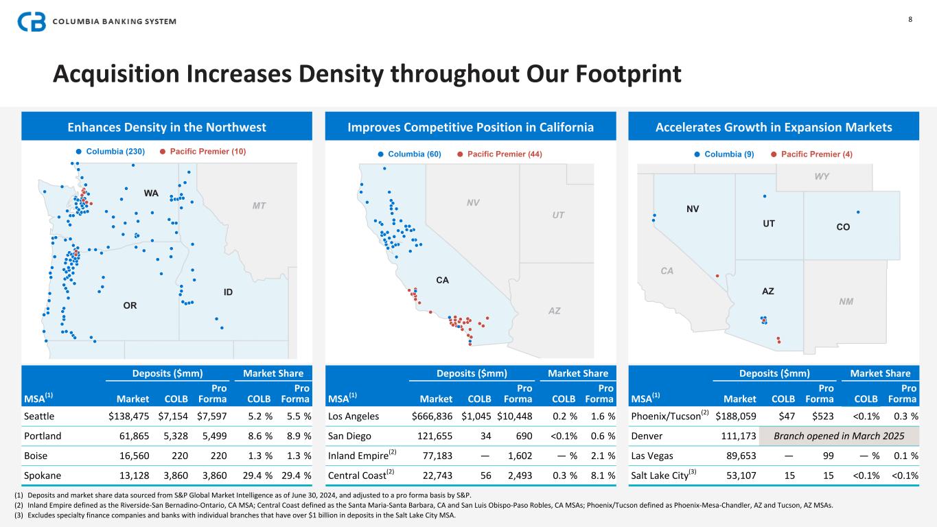 收购Pacific Premier增加规模和机会7(1)截至2025年6月30日,Columbia和Pacific Premier的合并备考财务数据不反映采购会计调整。(2)存款和市场份额数据来源于截至2024年6月30日的标普全球市场情报,并经标普调整为备考口径。南加州定义为:bakersfield-Delano,加利福尼亚州;El Centro,加利福尼亚州;Los Angeles-Long Beach-Anaheim,加利福尼亚州;Oxnard-Thousand Oaks-Ventura,加利福尼亚州;Riverside-San Bernardino-Ontario,加利福尼亚州;San Diego-Chula Vista-Carlsbad,加利福尼亚州;San Luis Obispo-Paso Robles,加利福尼亚州和Santa Maria-Santa Barbara,加利福尼亚州 MSA。(3)Franchise的百分比反映了加拿大皇家银行截至2024年7月31日的存款百分比。在南加州增加规模并增加在西北地区市场份额前十名中在南加州的份额(2)排名银行存款总额百分比($ mm)特许经营权1 摩根大通 $ 180,8137.5% 2美国银行145,9947.6% 3 富国银行 134,1589.8% 4加拿大皇家银行(3)53,0625.6% 5 美国合众银行 49,6299.5% 6 华美TERM3 43,19072.0% 7 花旗集团 42,6563.3% 8 Axos Financial 17,84392.2% 9加州银行17,74361.6% 10备考14,64426.1% 12 Pacific Premier 13,50992.4% 51 Columbia 1,1352.7% $ 70B资产$ 50B贷款$ 56B存款备考快照(1)