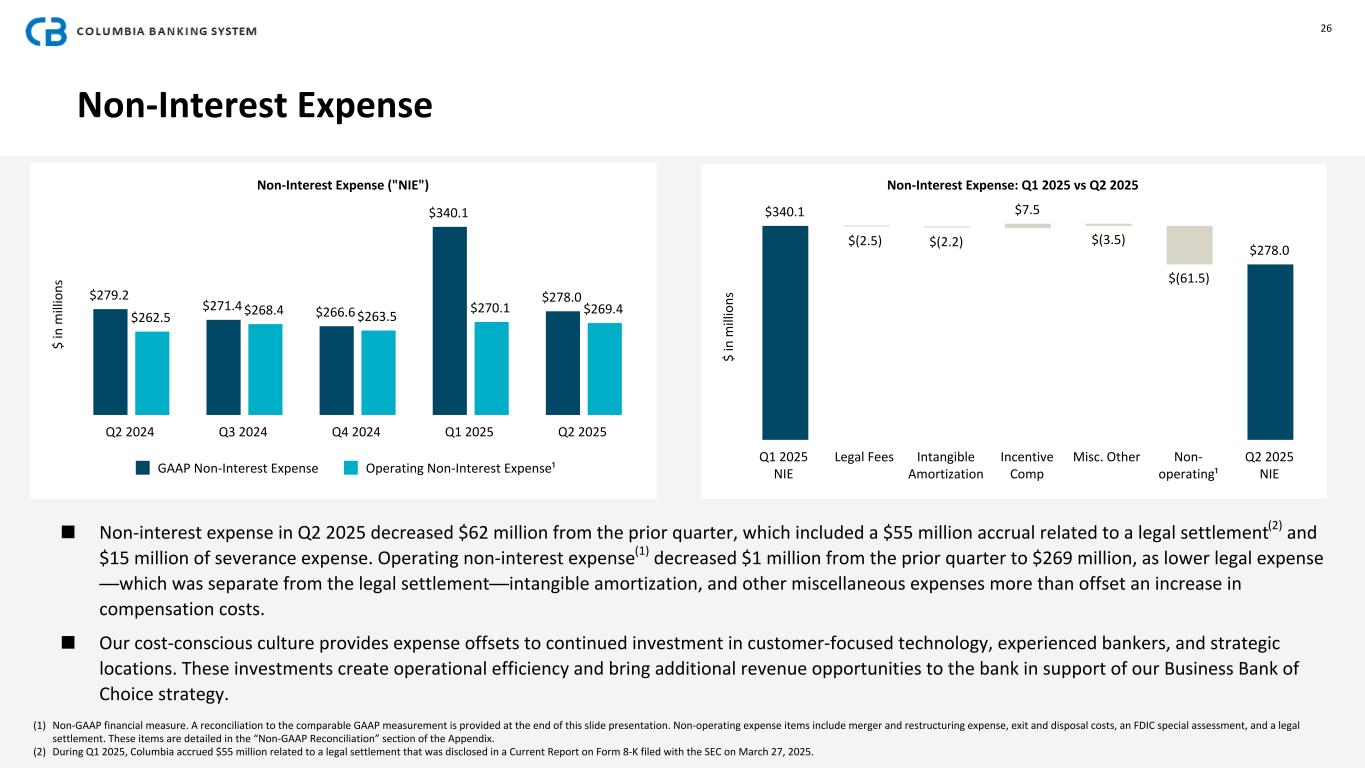 非利息费用26美元在m病io ns非利息费用(“NIE”)$ 279.2 $ 271.4 $ 266.6 $ 340.1 $ 278.0 $ 262.5 $ 268.4 $ 263.5 $ 270.1 $ 269.4 GAAP非利息费用运营非利息费用丨Q2 2024 Q3 2024 Q4 2024 Q1 2025Q2 2025 ■ 2025年第二季度的非利息费用比上一季度减少了6200万美元,其中包括与法律和解(2)相关的5500万美元应计费用和1500万美元的遣散费。运营非利息支出(1)较上一季度减少100万美元至2.69亿美元,原因是较低的法律支出——这与法律和解是分开的——无形摊销,以及其他杂项支出抵消了补偿成本的增加。■我们注重成本的文化为持续投资于以客户为中心的技术、经验丰富的银行家和战略地点提供了费用抵消。这些投资创造了运营效率,并为银行带来了额外的收入机会,以支持我们的首选商业银行战略。$ in m ill io ns非利息费用:2025年第一季度与2025年第二季度$ 340.1 $(2.5)$(2.2)$ 7.5 $(3.5)$(61.5)$ 278.0 2025年第一季度NIE法律费用无形摊销激励补偿杂项。其他非经营性丨2025年Q2 NIE(1)Non-GAAP财务计量。本幻灯片演示文稿末尾提供了与可比GAAP计量的对账。营业外支出项目包括合并重组费用、退出和处置费用、FDIC特别评估和法律和解。这些项目在附录的“非公认会计原则和解”部分中有详细说明。(2)在2025年第一季度,哥伦比亚累积了5500万美元,与一项法律和解有关,该和解在2025年3月27日提交给SEC的8-K表格的当前报告中披露。