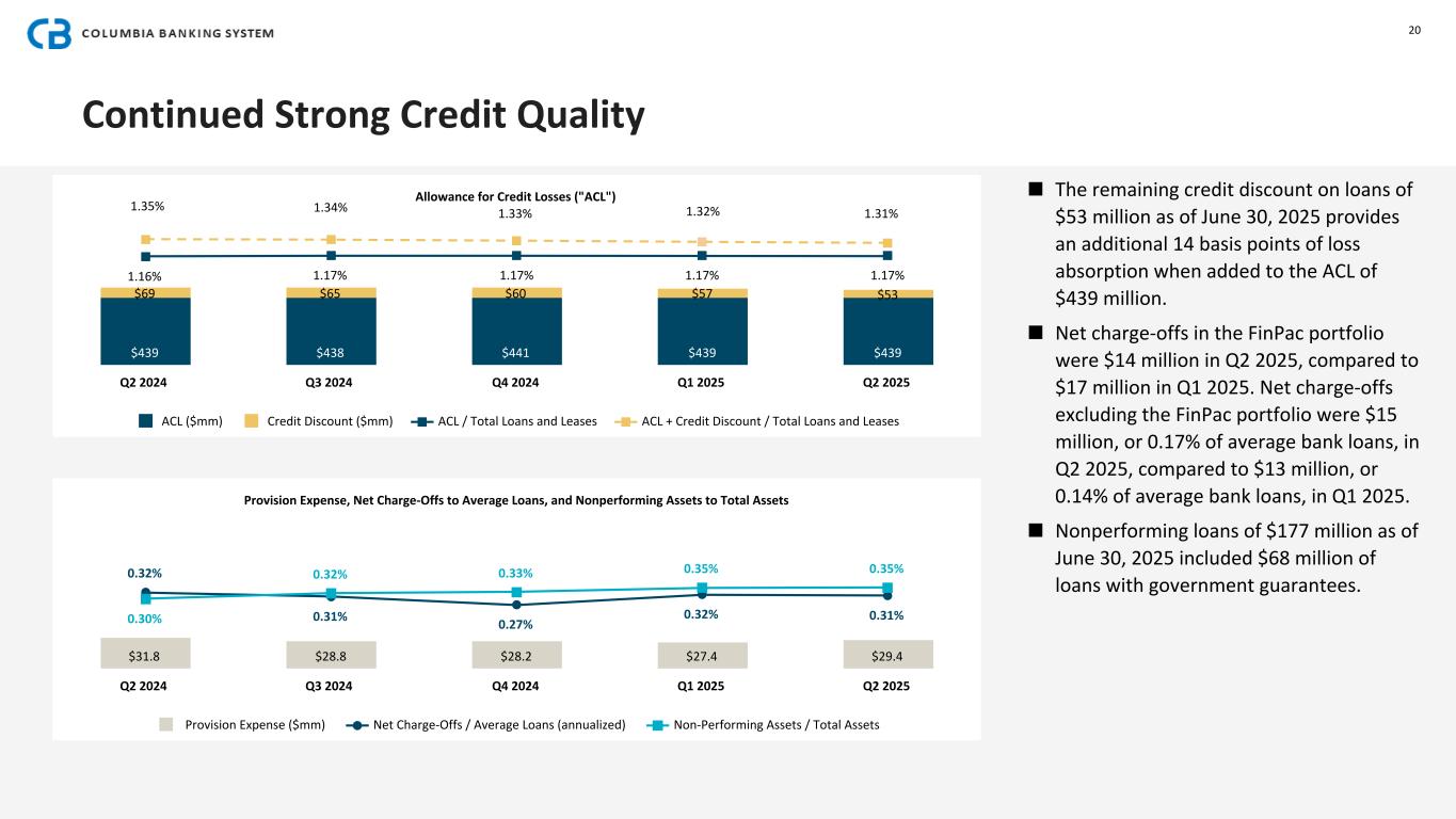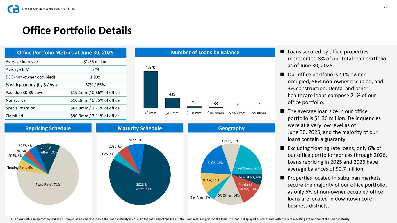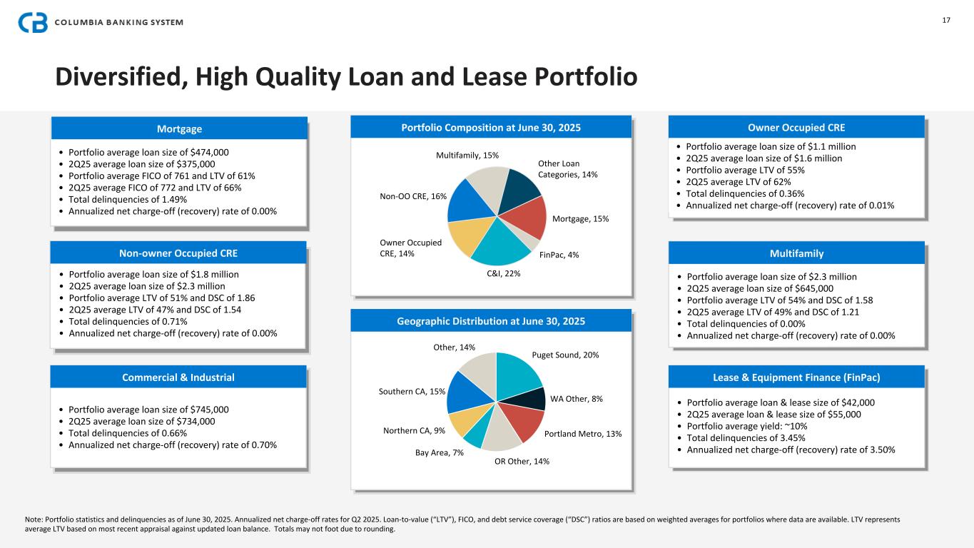 多元化、高质量的贷款和租赁组合注:截至2025年6月30日的组合统计和拖欠情况。2025年第二季度的年化净冲销率。贷款与价值(“LTV”)、FICO和偿债覆盖率(“DSC”)比率基于可获得数据的投资组合的加权平均值。LTV代表基于最新评估的平均LTV与更新的贷款余额。由于四舍五入,总数可能不够。•投资组合平均贷款规模为474,000美元• 2Q25平均贷款规模为375,000美元•投资组合平均FICO为761,LTV为61% • 2Q25平均FICO为772,LTV为66% •总拖欠率为1.49% •年化净冲销(回收)率为0.00非业主占用CRE •投资组合平均贷款规模为180万美元• 2Q25平均贷款规模为230万美元•投资组合平均LTV为51%,DSC为1.86 • 2Q25平均LTV为47%和DSC为1.54 •总拖欠率为0.71% •年化净冲销(回收)率为0.00%商业和工业•投资组合平均贷款规模为745,000美元• 2Q25平均贷款规模为734,000美元•总拖欠率为0.66% •年化净冲销(回收)率为0.70%多户家庭•投资组合平均贷款规模为230万美元• 2Q25平均贷款规模为645,000美元•投资组合平均LTV为54%,DSC为1.58 • 2Q25平均LTV为49%和DSC为1.21 •总拖欠率为0.000% •年化净冲销(回收)率为0.000%所有者占用CRE •投资组合平均贷款规模为110万美元• 2Q25平均贷款规模为160万美元•投资组合平均LTV为55% • 2Q25平均LTV为62% •总拖欠率为0.36% •年化净冲销(回收)率为0.01%租赁和设备融资(FinPAC)•投资组合平均贷款和租赁规模为4.2万美元• 2Q25平均贷款和租赁规模为5.5万美元•投资组合平均收益率:~10% •总拖欠率为3.45% •年化净冲销(回收)率3.50%普吉特海湾、20%西澳其他、8%波特兰地铁、13%或其他、14%湾区、7%北部加利福尼亚州、9%南部加利福尼亚州、15%其他、14%抵押贷款、15% FinPAC、4% C & I、22%业主自住CRE、14%非OO CRE、16%多户家庭、15%其他贷款类别、14%截至2025年6月30日的投资组合构成2025年6月30日的地理分布抵押贷款17