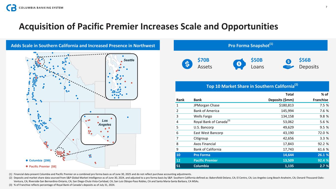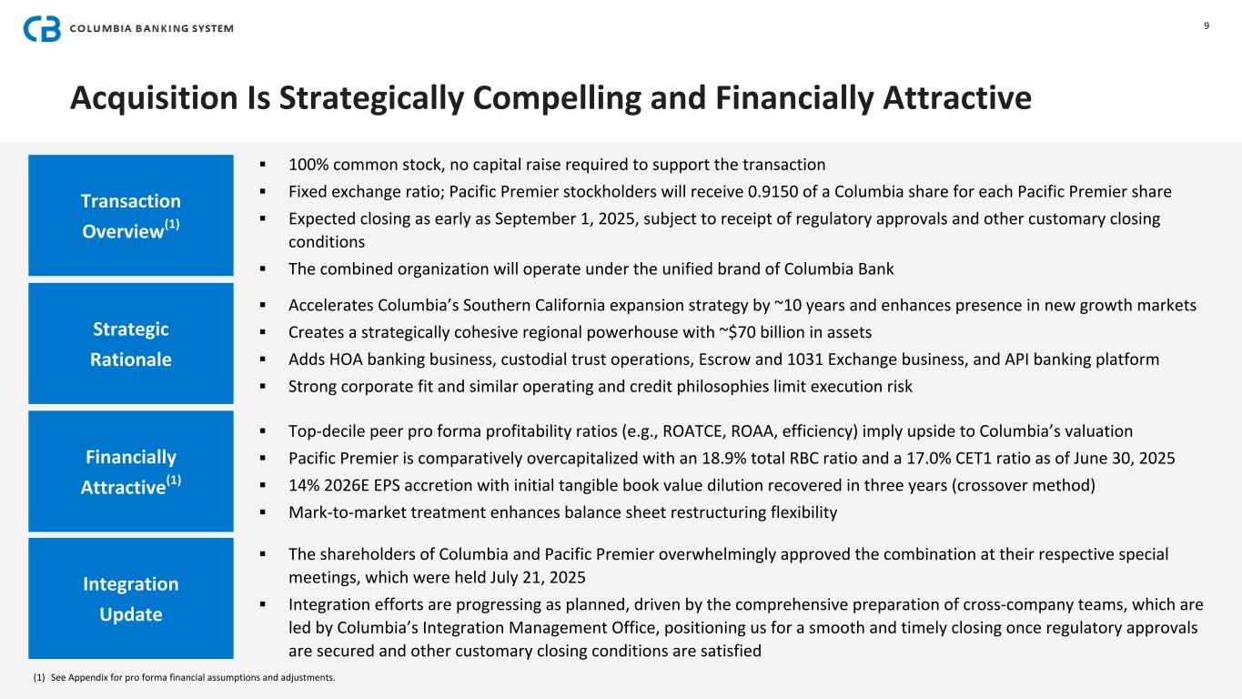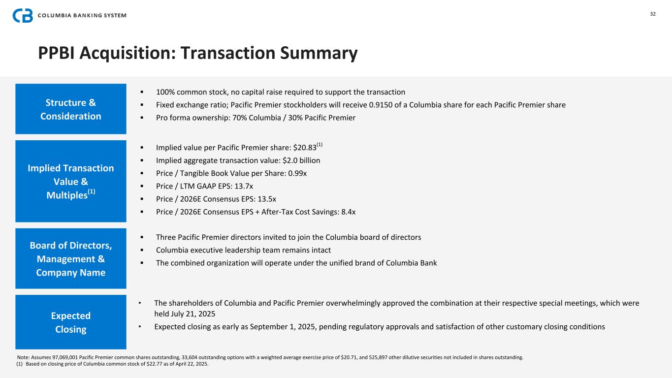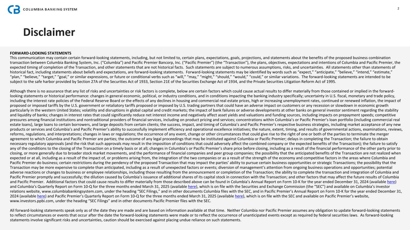 免责声明前瞻性陈述本通讯可能包含某些前瞻性陈述,包括但不限于某些计划、期望、目标、预测,以及有关Columbia Banking System, Inc.(“Columbia”)和Pacific Premier Bancorp, Inc.(“Pacific Premier Bancorp,Inc.”)之间拟议业务合并交易(“交易”)的利益的陈述,Columbia和Pacific Premier的计划、目标、期望和意图,交易完成的预期时间,以及其他非历史事实的陈述。此类陈述受到众多假设、风险和不确定性的影响。除历史事实陈述之外的所有陈述,包括关于信念和期望的陈述,都是前瞻性陈述。前瞻性陈述可以通过“预期”、“预期”、“相信”、“打算”、“估计”、“计划”、“相信”、“目标”、“目标”等词语或类似表达方式,或未来或条件动词,如“将”、“可能”、“可能”、“应该”、“将”、“可能”或类似变体来识别。这些前瞻性陈述旨在遵守1933年《证券法》第27A条、1934年《证券交易法》第21E条和1995年《私人证券诉讼改革法》提供的安全港。尽管无法保证任何风险和不确定性或风险因素清单都是完整的,但以下是可能导致实际结果与前瞻性陈述或历史业绩中包含或暗示的结果存在重大差异的某些因素:总体经济、政治或行业状况的变化,以及具体影响银行业的情况;美国财政、货币和贸易政策的不确定性,包括联邦储备委员会的利率政策或住房和商业房地产价格下跌的影响、高失业率或不断增加的失业率、持续或重新出现的通胀,美国政府提议或征收的关税或美国贸易伙伴提议或征收的报复性关税的影响,可能对客户产生不利影响或经济增长出现任何衰退或放缓,特别是在美国西部;全球资本和信贷市场的波动和中断;银行倒闭或其他银行的不利发展对投资者关于银行稳定性和流动性的普遍情绪的影响;可能显着降低净利息收入并对资产收益率、估值和资金来源产生负面影响的利率变化,包括对提前还款速度的影响;金融机构和非传统金融服务提供商之间的竞争压力,包括对产品定价和服务的压力;哥伦比亚或太平洋总理的贷款组合(包括商业房地产贷款)、对某些借款人的大额贷款以及某些客户的大额存款的集中度;哥伦比亚和太平洋总理各自业务战略的成功、影响和时机,包括任何新产品或服务的市场接受度以及哥伦比亚和太平洋总理成功实施效率和卓越运营举措的能力;政府行动、审查、审查、改革、法规的性质、程度、时机和结果,和解释;法律法规的变化;任何事件的发生,可能导致一方或双方有权终止Columbia和Pacific Premier作为当事方的合并协议的变更或其他情况;可能对Columbia或Pacific Premier提起的任何法律诉讼的结果;延迟完成交易;未能获得必要的监管批准(以及此类批准可能导致施加条件的风险可能对合并后公司或交易的预期收益产生不利影响);未能及时或根本不满足交易完成的任何条件;Columbia或Pacific Premier在收盘前的股价变化,包括由于收盘前另一方的财务表现,或更普遍地由于更广泛的股票市场走势,以及金融公司和同行集团公司的表现;交易的预期收益未能在预期时实现或根本没有实现的可能性,包括由于所产生的影响或所产生的问题, 两家公司的整合或由于Columbia和Pacific Premier开展业务的地区的经济实力和竞争因素;拟议交易未决期间可能影响各方寻求某些商业机会或战略交易的能力的某些限制;交易完成成本可能比预期更高的可能性,包括由于意外因素或事件;将管理层的注意力从正在进行的业务运营和机会上转移;对业务或员工关系的潜在不利反应或变化,包括因公告或完成交易而产生的;及时、成功完成Columbia和Pacific Premier的交易和整合的能力;Columbia就交易增发其股本股份造成的稀释;以及可能影响Columbia和Pacific Premier未来业绩的其他因素。可能导致结果与上述结果存在重大差异的其他因素,可在哥伦比亚截至2024年12月31日止年度的10-K表格年度报告(可在此处查阅)和哥伦比亚截至2025年3月31日止三个月的10-Q表格季度报告(可在此处查阅)中找到,该报告已在美国证券交易委员会(“SEC”)存档,并可在哥伦比亚的投资者关系网站www.columbiabankingsystem.com上查阅,标题为“SEC文件”,哥伦比亚向SEC提交的其他文件,以及Pacific Premier截至2024年12月31日止年度的10-K表格年度报告(可在此处查阅)和Pacific Premier截至2025年3月31日止三个月的10-Q表格季度报告(可在此处查阅),这些文件已在SEC存档,并可在Pacific Premier网站www.investors.ppbi.com的“SEC文件”标题下查阅,以及Pacific Premier向SEC提交的其他文件中。所有前瞻性陈述仅在作出之日发表,并基于当时可获得的信息。除联邦证券法要求外,Columbia和Pacific Premier均不承担更新前瞻性陈述以反映前瞻性陈述作出之日之后发生的情况或事件或反映意外事件发生的任何义务。由于前瞻性陈述涉及重大风险和不确定性,应谨慎行事,不要过分依赖此类陈述。2