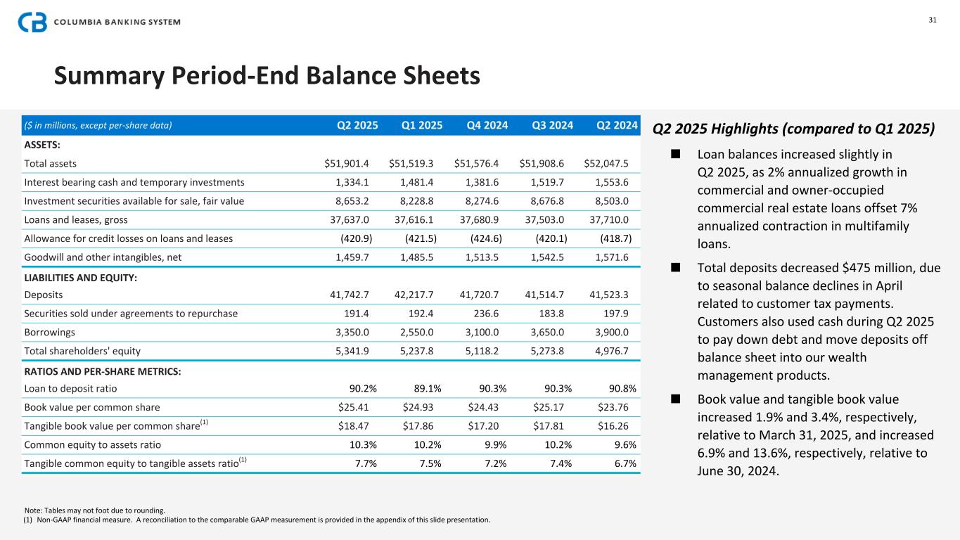 期末资产负债表摘要注:由于四舍五入,表格可能不够用。(1)Non-GAAP财务计量。本幻灯片演示的附录中提供了与可比GAAP计量的对账。(百万美元,每股数据除外)Q2 2025 Q1 2025 Q4 2024 Q3 2024 Q2 2024资产:总资产$ 51,901.4 $ 51,519.3 $ 51,576.4 $ 51,908.6 $ 52,047.5计息现金和临时投资1,334.11,481.41,381.61,519.71,553.6可供出售投资证券,公允价值8,653.28,228.88,274.68,676.88,503.0贷款和租赁,毛额37,637.037,616.13 7,68 0.937,503.037,710.0贷款和租赁信用损失备抵(420.9)(421.5)(424.6)(420.1)(418.7)商誉和其他无形资产,净额1,459.71,485.51,513.51,542.51,571.6负债和权益:存款41,742.742,217.741,720.741,514.741,523.3根据回购协议出售的证券191.4 192.42 36.6 183.8 197.9借款3,350.02,550.03,100.03,650.03,900.0股东权益总额5,341.95,237.85,118.25,273.84,976.7比率和每股指标:贷存比90.2% 89.1% 90.3% 90.3% 90.8%每股普通股账面价值$ 25.41 $ 24.93 $ 24.43 $ 25.17 $ 23.76每股普通股有形账面价值(1)$ 18.47 $ 17.86 $ 17.20 $ 17.81 $ 16.26普通股权益资产比10.3% 10.2% 9.9(与2025年第一季度相比)■ 2025年第二季度贷款余额略有增加,因为商业和自住商业房地产贷款年化增长2%,抵消了多户家庭贷款年化收缩7%的影响。■存款总额减少4.75亿美元,原因是4月份与客户缴税有关的季节性余额下降。客户还在2025年第二季度使用现金来偿还债务,并将存款转移到资产负债表之外的我们的理财产品中。■账面价值和有形账面价值相对于2025年3月31日分别增长1.9%和3.4%,相对于2024年6月30日分别增长6.9%和13.6%。