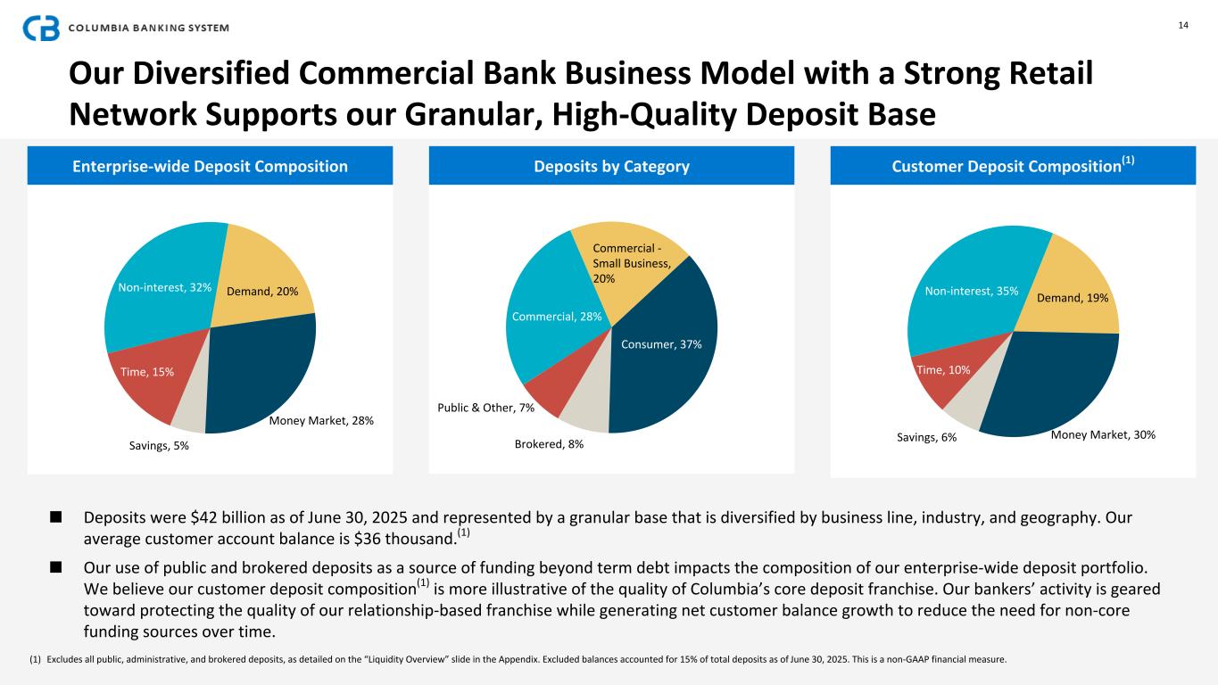 2025年第二季度亮点13 ■成功开展了小型企业和零售活动,该活动一直持续到7月中旬,为该银行带来了超过4.5亿美元的新存款。该活动还成功地产生了新的SBA借贷关系。■在亚利桑那州开设两家分行,加强了对凤凰城及周边市场银行家和客户的支持。俄勒冈州东部也开设了一家分行,为服务不足的农村社区带来了必要的银行服务。■在营业时间扩展了Go-to Virtual Assistant,以提高我们服务客户的能力并提高员工效率。■增加Judi Giem为首席人力资源官,扩大了哥伦比亚的行政领导人才。Giem女士为上市公司带来了超过20年的全面人力资源领导经验。■因我们在2024年的慈善工作而获得普吉特海湾商业杂志的企业公民奖。■在4月份的Melanie Dressel社区承诺月期间,我们的足迹中有超过3800小时的员工志愿服务,支持了422个独特的慈善机构。报告经营(1)1.52亿美元1.6亿美元净收入2.33亿美元2.42亿美元拨备前净收入(1)拨备前净收入0.73美元0.76美元每股收益-稀释每股收益-稀释后1.19% 1.25%资产收益率资产收益率1.81% 1.88% PPNR资产收益率(1)PPNR资产收益率11.56% 12.16%股本收益率16.03% 16.85%有形普通股收益率(1)有形普通股收益率(1)非公认会计准则财务计量。本幻灯片演示的附录中提供了与每一项的可比GAAP衡量标准的对账。