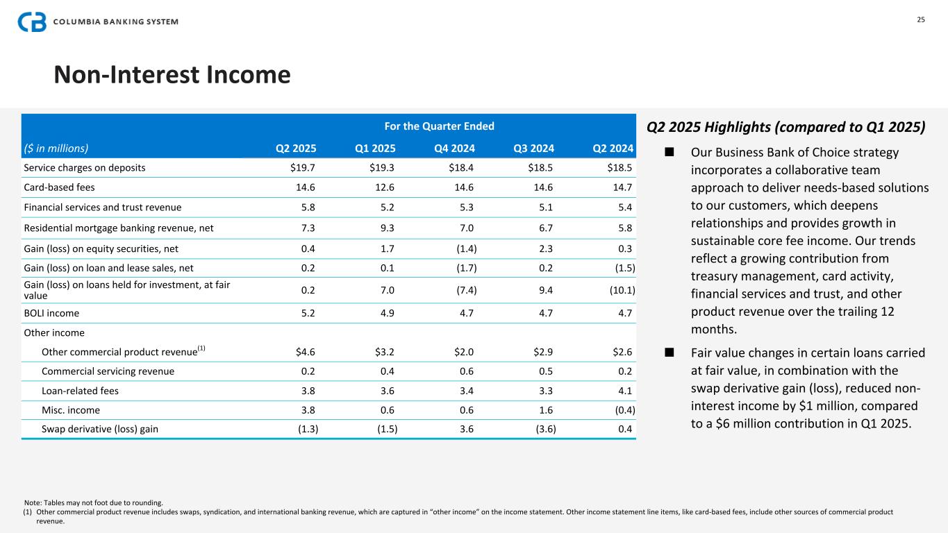 非利息收入注:由于四舍五入,表可能不够脚。(1)其他商业产品收入包括掉期、银团、国际银行收入,在损益表“其他收入”中体现。其他损益表项目,如基于卡的费用,包括其他商业产品收入来源。截至本季度(百万美元)Q2 2025 Q4 2024 Q3 2024 Q2 2024存款服务费19.7美元19.3美元18.4美元18.5美元18.5美元基于卡的费用14.61 2.61 4.61 4.7金融服务和信托收入5.85.25.35.15.4住宅抵押贷款银行业务收入净额7.39.37.06.75.8权益证券收益(亏损)净额0.4 1.7(1.4)2.3 0.3贷款和租赁销售收益(亏损)净额0.2 0.1(1.7)0.2(1.5)为投资而持有的贷款收益(亏损),按公允价值计算0.27.0(7.4)9.4(10.1)BOLI收入5.2 4.9 4.7 4.7 4.7 4.7其他收入其他商业产品收入(1)$ 4.6 $ 3.2 $ 2.0 $ 2.9 $ 2.6商业服务收入0.2 0.4 0.6 0.5 0.2与贷款相关的费用3.8 3.6 3.4 3.3 4.1杂项收入3.8 0.6 0.6 0.6 1.6(0.4)掉期衍生工具(损失)收益(1.3)(1.5)3.6(3.6)0.4252025年第二季度亮点(与2025年第一季度相比)■我们的业务首选银行战略采用协作团队方法,为我们的客户提供基于需求的解决方案,这加深了关系并提供了可持续核心费用收入的增长。我们的趋势反映出,在过去12个月中,资金管理、卡活动、金融服务和信托以及其他产品收入的贡献越来越大。■以公允价值计量的某些贷款的公允价值变动,加上掉期衍生工具收益(损失),使非利息收入减少了100万美元,而2025年第一季度的贡献为600万美元。