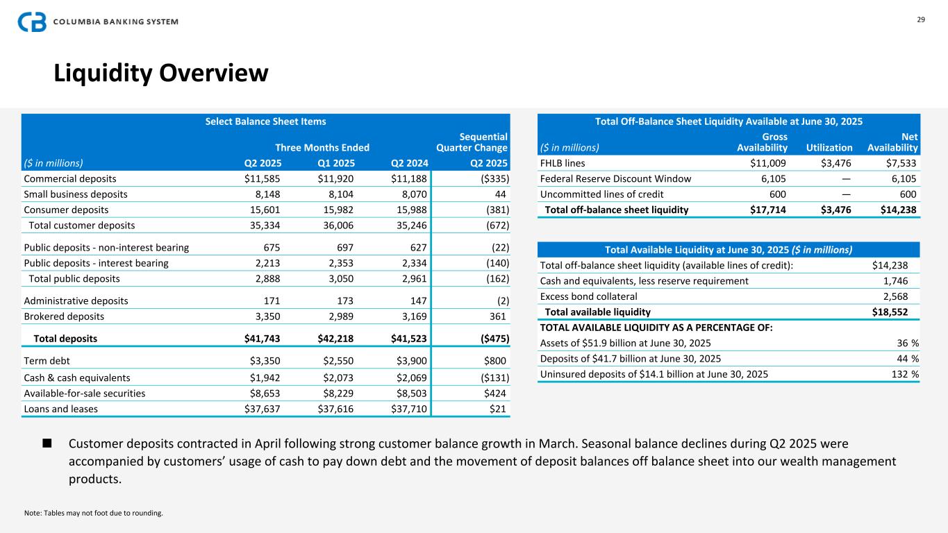 流动性概览2025年6月30日可用流动性总额(百万美元)表外流动性总额(可用信贷额度):14,238美元现金及等价物,减准备金要求1,746超额债券抵押品2,568可用流动性总额18,552美元可用流动性总额百分比:2025年6月30日资产519亿美元36% 2025年6月30日存款417亿美元44% 2025年6月30日无保险存款141亿美元132% 6月30日可用表外流动性总额,2025年(百万美元)总可用性利用率净可用性FHLB额度11,009美元3,476美元7,533美元美联储贴现窗口6,105 — 6,105未承诺信贷额度600 — 600表外流动性总额17,714美元3,476美元14,23829 ■继3月份客户余额强劲增长之后,4月份客户存款出现收缩。2025年第二季度的季节性余额下降伴随着客户使用现金偿还债务以及将存款余额转移到表外进入我们的理财产品。选择资产负债表项目三个月结束连续季度变化(百万美元)2025年第二季度2025年第一季度2025年第二季度2024年第二季度2025年商业存款11,585美元11,920美元11,188美元(335美元)小企业存款8,1488,1048,07044消费者存款15,60115,98215,988(381)客户存款总额35,33436,00635,246(672)公众存款-不计息675697627(22)公众存款-计息2,2132,3532,334(140)公众存款总额2,8883,0502,961(162)行政存款171173147(2)经纪存款3,3502,9893,169361存款总额41,743美元42,218美元41,523美元(475美元)定期债务3,350美元2等值美元1,942美元2,073美元2,069美元(131美元)可供出售证券8,653美元8,229美元8,503美元424美元贷款和租赁37,637美元37,616美元37,710美元21美元注:由于四舍五入,表格可能不适用。