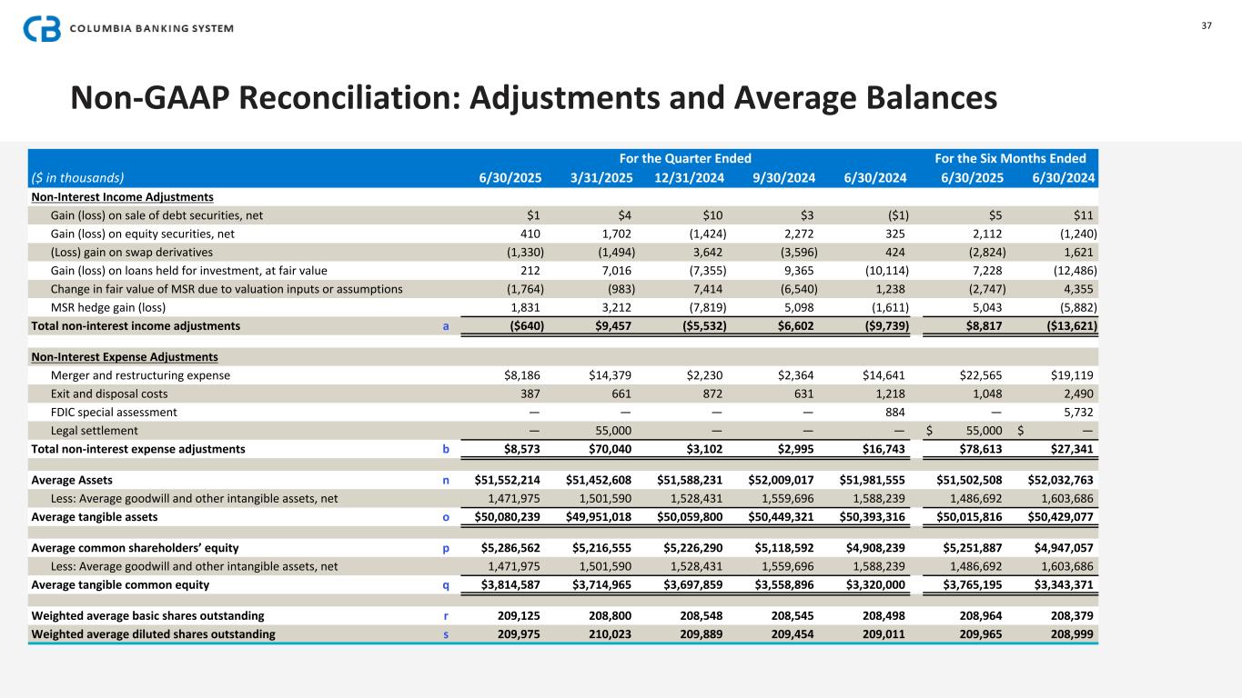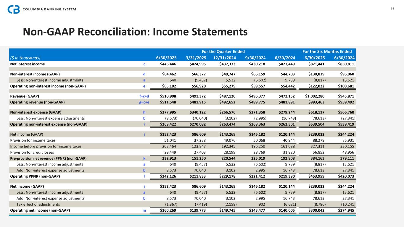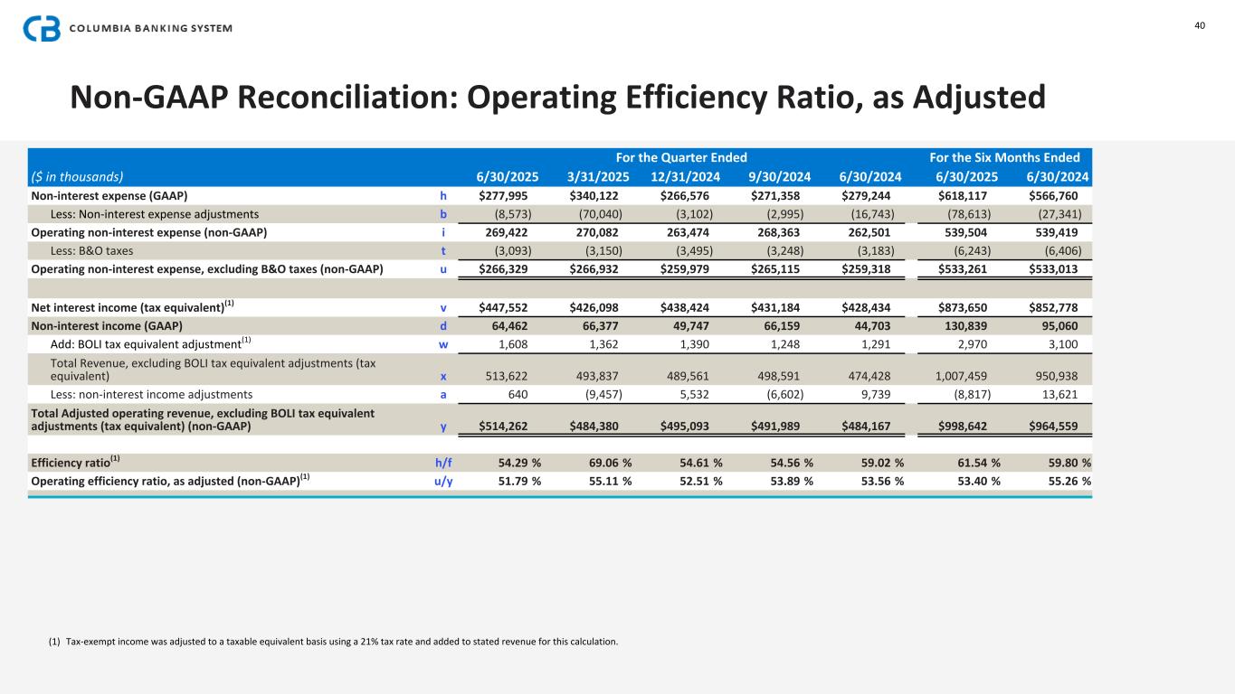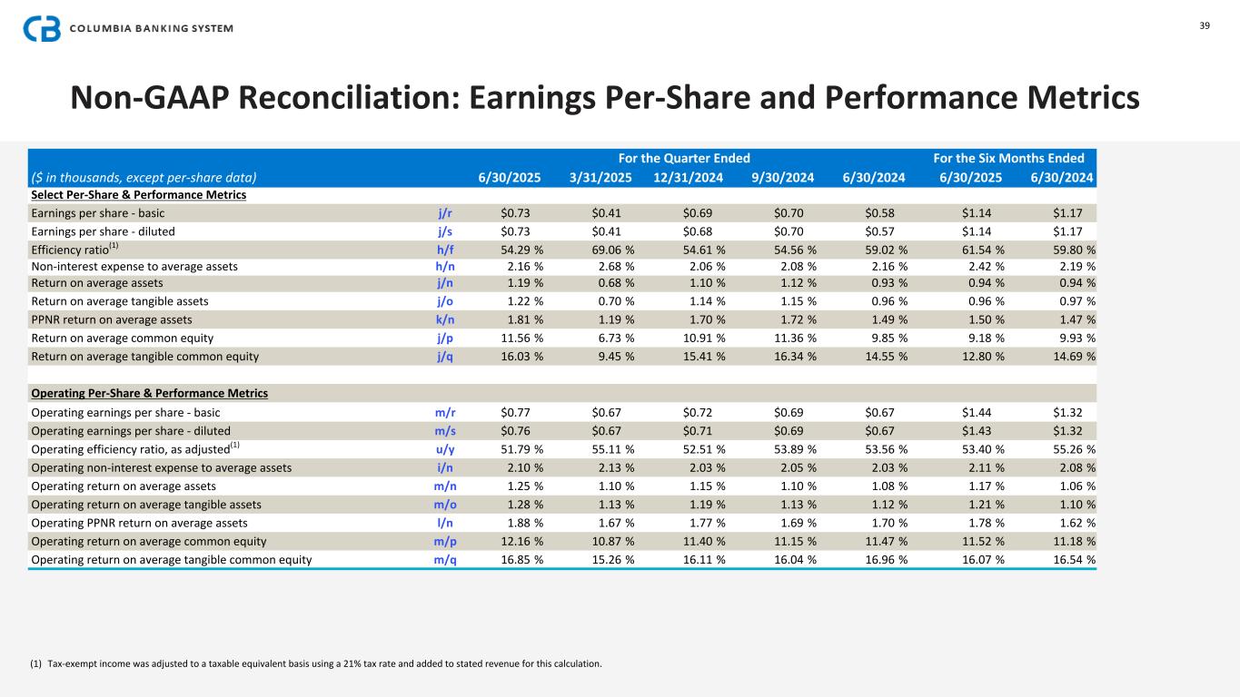 非美国通用会计准则对账:截至六个月的季度每股收益和业绩指标(单位:千美元,每股数据除外)6/30/20253/31/202512/31/20249/30/20246/30/20246/30/20256/30/2024 Select per Share & Performance Metrics Earnings per share-basic j/r $ 0.73 $ 0.41 $ 0.69 $ 0.70 $ 0.58 $ 1.14 $ 1.17 Earnings per share-dilted j/s $ 0.73 $ 0.41 $ 0.68 $ 0.70 $ 0.57 $ 1.14 $ 1.17 Efficiency ratio(1)h/f 54.29% 69.06% 54.61% 54.56% 59.02% 61.54% 59.80% Non-interest expense to average assets h/n 2.16% 2.68% 2.06% 2.08% 2.16% 2.42% 2.19%平均资产收益率j/n 1.19% 0.6有形资产j/o 1.22% 0.70% 1.14% 1.15% 0.96% 0.96% 0.97% PPNR平均资产回报率k/n 1.81% 1.19% 1.70% 1.72% 1.49% 1.50% 1.47%平均普通股权益回报率j/p 11.56% 6.73% 10.91% 11.36% 9.85% 9.18% 9.93%平均有形普通股权益回报率j/q 16.03% 9.45% 15.41% 16.34% 14.55% 12.80% 14.69%每股经营收益&业绩指标每股经营收益-基本m/r $ 0.77 $ 0.67 $ 0.72 $ 0.69 $ 0.67 $ 1.44 $ 1.32营业利润每股-摊薄m/s 0.76美元0.67美元0.71美元0.69美元0.67美元1.43美元1.32美元运营效率比,经调整(1)u/y 51.79% 55.11% 52.51% 53.89% 53.56% 53.40% 55.26%经营性非利息费用占平均资产i/n 2.10% 2.13% 2.03% 2.05% 2.03% 2.11% 2.08%经营性平均资产收益率m/n 1.25% 1.10% 1.15% 1.10% 1.08% 1.17% 1.06%经营性平均有形资产收益率m/o 1.28% 1.13% 1.19% 1.13% 1.12% 1.21% 1.10%经营性PPNR平均资产收益率l/n 1.88% 1.67% 1.77% 1.69% 1.70% 1.78% 1.62%平均普通股经营回报率m/p 12.16% 10.87% 11.40% 11.15% 11.47% 11.52% 11.18%平均有形普通股经营回报率m/q 16.85% 15.26% 16.11% 16.04% 16.96% 16.07% 16.54%(1)免税收入采用21%的税率调整为应税等值基础,并为此计算加入申报收入。39