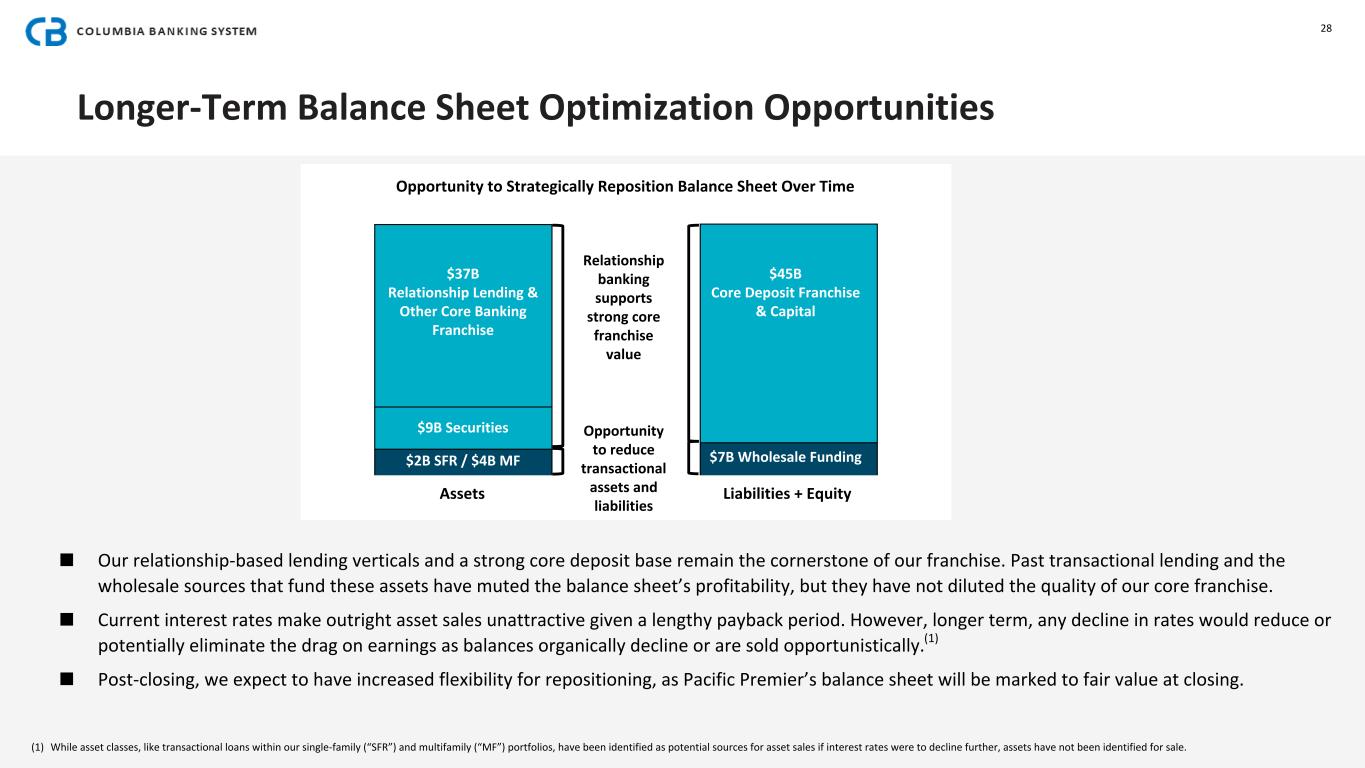 长期资产负债表优化机会28 ■我们基于关系的贷款垂直领域和强大的核心存款基础仍然是我们特许经营的基石。过去的交易借贷和为这些资产提供资金的批发来源降低了资产负债表的盈利能力,但它们并没有稀释我们核心特许经营权的质量。■当前利率使得直接出售资产没有吸引力,因为回收期很长。然而,更长期来看,随着余额有机下降或被机会性出售,利率的任何下降都将减少或潜在地消除对盈利的拖累。(1)■交易结束后,我们预计重新定位的灵活性将增加,因为Pacific Premier的资产负债表将在交易结束时标记为公允价值。有机会随着时间的推移战略性地重新定位资产负债表资产负债+股权$ 7B批发融资$ 2B SFR/$ 4B MF $ 9B证券$ 37B关系贷款和其他核心银行业务特许经营权$ 45B核心存款特许经营权和资本减少交易资产和负债的机会关系银行业务支持强大的核心特许经营价值(1)而资产类别,如我们的单户家庭(“SFR”)和多户家庭(“MF”)投资组合中的交易贷款,已被确定为潜在的资产出售来源,如果利率进一步下降,资产尚未确定可供出售。
