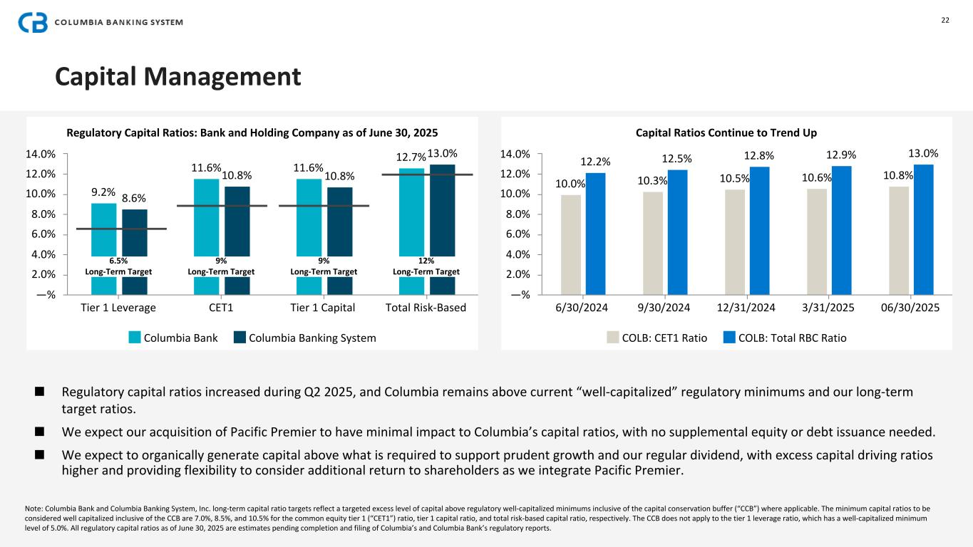 资本管理22监管资本比率:截至2025年6月30日的银行和控股公司9.2% 11.6% 11.6% 12.7% 8.6% 10.8% 10.8% 13.0%哥伦比亚银行哥伦比亚银行系统一级杠杆CET1一级资本总风险基础——% 2.0% 4.0% 6.0% 8.0% 10.0% 12.0% 14.0% ■ 2025年第二季度监管资本比率有所提高,哥伦比亚仍高于当前“资本充足”的监管最低要求和我们的长期目标比率。■我们预计我们对Pacific Premier的收购对Columbia的资本比率影响微乎其微,不需要补充股权或债务发行。■我们预计将有机地产生高于支持审慎增长和我们的定期股息所需的资本,超额资本推动比率更高,并在我们整合Pacific Premier时提供考虑额外股东回报的灵活性。注:哥伦比亚银行和哥伦比亚银行系统,Inc.的长期资本比率目标反映了资本充足的监管最低限度以上的目标超额资本水平,其中包括适用的资本节约缓冲(“CCB”)。对于普通股权一级(“CET1”)比率、一级资本比率和总风险资本比率,被视为资本充足(含CCB)的最低资本比率分别为7.0%、8.5%和10.5%。CCB不适用于一级杠杆率,后者的资本充足的最低水平为5.0%。截至2025年6月30日的所有监管资本比率均为哥伦比亚银行和哥伦比亚银行监管报告完成和备案前的估计值。资本比率继续呈上升趋势10.0% 10.3% 10.5% 10.6% 10.8% 12.2% 12.5% 12.8% 12.9% 13.0% COLB:CET1比率COLB:总RBC比率6/30/20249/30/202412/31/20243/31/202506/30/2025 —% 2.0% 4.0% 6.0% 8.0% 10.0% 12.0% 14.0% 12%长期目标9%长期目标9%长期目标6.5%长期目标