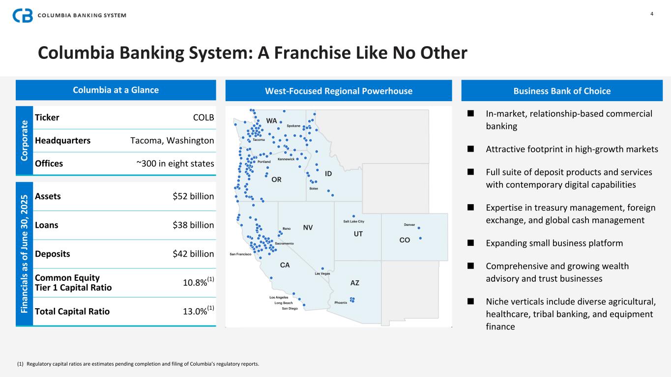 哥伦比亚银行系统:独一无二的特许经营4家专注于西方的区域强国商业银行的首选■市场内、基于关系的商业银行■在高增长市场的有吸引力的足迹■具有现代数字化能力的全套存款产品和服务■在资金管理、外汇和全球现金管理方面拥有专长■扩展小型企业平台■全面且不断增长的财富咨询和信托业务■细分垂直领域包括多样化的农业、医疗保健、部落银行和设备金融Columbia at a Glance Co Rp或在e Ticker丨COLB丨总部门Tacoma,华盛顿在八个州的办事处~300家Fi na NC ia ls a s of Ju ne 30,2025资产520亿美元贷款380亿美元存款420亿美元普通股一级资本比率10.8%(1)总资本比率13.0%(1)(1)监管资本比率是在哥伦比亚监管报告完成和提交之前的估计。