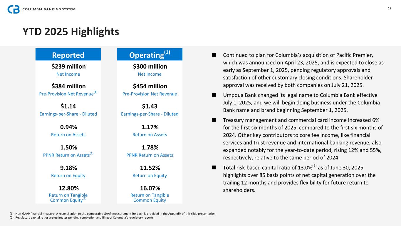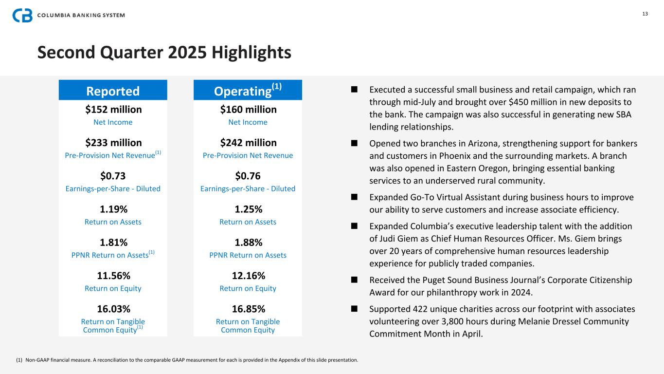 2025年初至今亮点12 ■继续筹划哥伦比亚对Pacific Premier的收购,该收购于2025年4月23日宣布,预计最早将于2025年9月1日完成,等待监管部门的批准和其他惯例成交条件的满足。两家公司均于2025年7月21日收到股东批准。■ Umpqua银行自2025年7月1日起将其法定名称更改为哥伦比亚银行,我们将从2025年9月1日开始以哥伦比亚银行的名称和品牌开展业务。■与2024年前六个月相比,2025年前六个月的资金管理和商业卡收入增长了6%。核心手续费收入的其他主要贡献者,如金融服务和信托收入以及国际银行业务收入,今年迄今也明显扩张,相对于2024年同期分别增长了12%和55%。■截至2025年6月30日,基于风险的总资本比率为13.0%(2),凸显了过去12个月中超过85个基点的净资本生成,并为未来的股东回报提供了灵活性。报告的经营(1)2.39亿美元3亿美元净收入净收入3.84亿美元4.54亿美元拨备前净收入(1)拨备前净收入1.14美元1.43美元每股收益-稀释每股收益-稀释后0.94% 1.17%资产收益率1.50% 1.78% PPNR资产收益率(1)PPNR资产收益率9.18% 11.52%净资产收益率12.80% 16.07%有形普通股收益率(1)有形普通股收益率(1)非公认会计准则财务计量。本幻灯片演示的附录中提供了与每一项的可比GAAP衡量标准的对账。(2)监管资本比率是在完成和提交哥伦比亚监管报告之前的估计。
