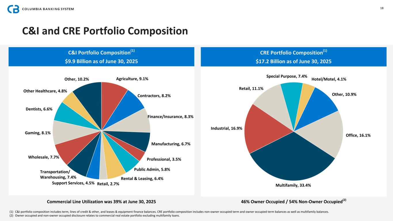 C & I和CRE投资组合构成农业,9.1%承包商,8.2%金融/保险,8.3%制造业,6.7%专业,3.5%公共管理,5.8%租赁和租赁,6.4%零售,2.7%支持服务,4.5%运输/仓储,7.4%批发,7.7%博彩,8.1%牙医,6.6%其他医疗保健,4.8%其他,10.2%办公,16.1%多户家庭,33.4%工业,16.9%零售,11.1%特殊用途,7.4%酒店/汽车旅馆,4.1%其他,10.9% CRE投资组合构成(1)截至2025年6月30日172亿美元C & I投资组合构成(1)截至2025年6月30日99亿美元(1)C & I投资组合构成包括期限、信贷额度和其他,以及租赁和设备融资余额。CRE投资组合构成包括非业主占用期限和业主占用期限余额以及多户家庭余额。(2)自住和非自住披露涉及商业地产组合,不包括多户贷款。46%业主占用/54%非业主占用(2)2025年6月30日商业线路利用率为39% 18