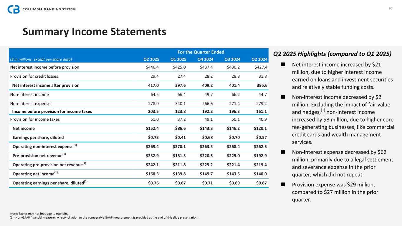 简要利润表注:由于四舍五入的原因,表格可能不够用。(1)Non-GAAP财务计量。本幻灯片演示文稿末尾提供了与可比GAAP计量的对账。截至本季度末(百万美元,每股数据除外)Q2 2025 Q1 2025 Q4 2024 Q3 2024 Q2 2024拨备前净利息收入$ 446.4 $ 425.0 $ 437.4 $ 430.2 $ 427.4信贷损失拨备29.427.428.228.83 1.8拨备后净利息收入417.03 97.6409.2401.4395.6非利息收入64.566.4 49.7 66.24 4.7非利息费用278.03 40.12 66.6271.4279.2所得税拨备前收入203.5 123.8 192.3 196.3161.1所得税拨备51.03 7.24 9.15 0.14 0.9净收入$ 152.4 $ 86.6 $ 143.3 $ 146.2 $ 120.1每股收益,稀释后0.73美元0.41美元0.68美元0.70美元0.57美元运营非利息支出(1)269.4美元270.1美元263.5美元268.4美元262.5美元拨备前净收入(1)232.9美元151.3美元220.5美元225.0美元192.9美元运营拨备前净收入(1)242.1美元211.8美元229.2美元221.4美元219.4美元运营净收入(1)160.3美元139.8美元149.7美元143.5美元140.0美元每股运营收益,稀释后(1)0.76美元0.67美元0.71美元0.69美元0.67美元2025年第二季度30日亮点(与2025年第一季度相比)■净利息收入增加了2100万美元,原因是贷款和投资证券赚取的利息收入增加,融资成本相对稳定。■非利息收入减少200万美元。剔除公允价值和对冲的影响,(1)非利息收入增加了800万美元,这是由于更高的核心收费业务,如商业信用卡和财富管理服务。■非利息支出减少了6200万美元,主要是由于上一季度的法律和解和遣散费,没有重复。■拨备费用为2900万美元,上一季度为2700万美元。