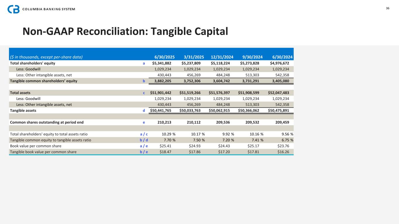 非公认会计准则调节:有形资本(以千美元计,每股数据除外)6/30/20253/31/202512/31/20249/30/20246/30/2024股东权益总额a $ 5,341,882 $ 5,237,809 $ 5,118,224 $ 5,273,828 $ 4,976,672减:商誉1,029,2341,029,2341,029,2341,029,2341,029,234减:其他无形资产净额430,443456,269484,248513,303542,358有形普通股股东权益b 3,882,2053,752,3063,604,7423,731,2913,405,080总资产c $ 51,901,442 $ 51,519,净额430,443456,269484,248513,303542,358有形资产d $ 50,441,765 $ 50,033,763 $ 50,062,915 $ 50,366,062 $ 50,475,891期末已发行普通股e 210,213210,112209,536209,532209,459股东权益总额与总资产比率a/c 10.29% 10.17% 9.92% 10.16% 9.56%有形普通股权益与有形资产比率b/d 7.70% 7.50% 7.20% 7.41% 6.75%每股普通股账面价值a/e $ 25.41 $ 24.93 $ 24.43 $ 25.17 $ 23.76每股普通股有形账面价值b/e $ 18.47 $ 17.86 $ 17.20 $ 17.81 $ 16.26 36