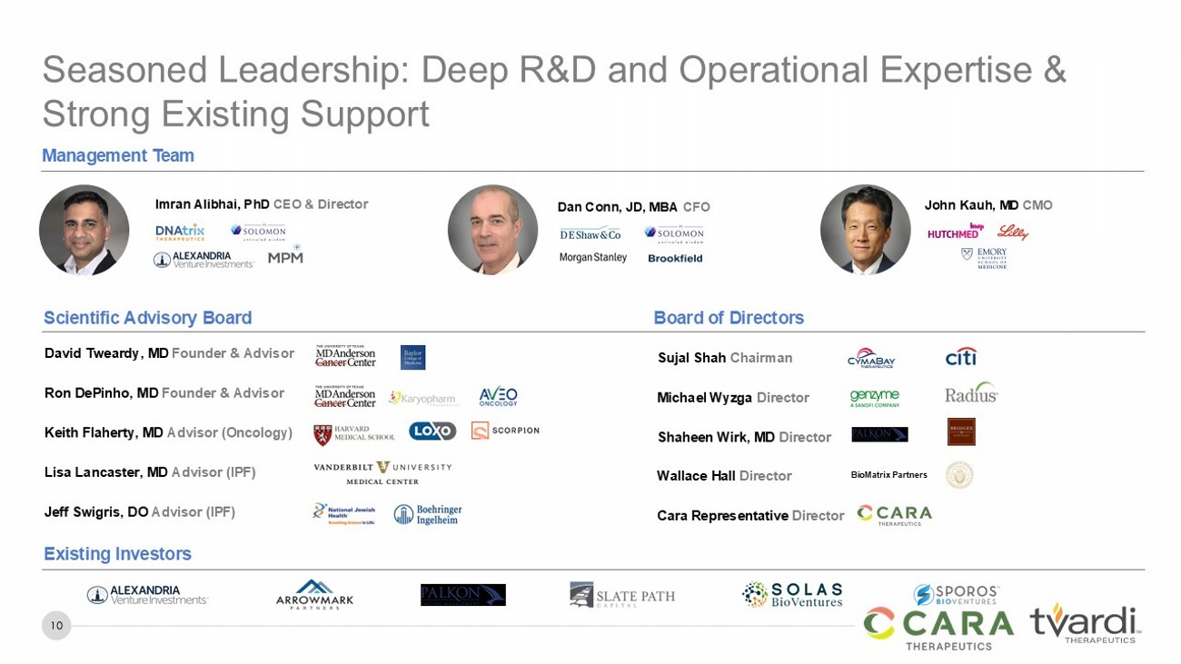 10 Sujal Shah董事长Michael Wyzga董事Shaheen Wirk、MD董事Wallace Hall董事Cara代表董事经验丰富的领导力:深厚的研发和运营专长&强大的现有支持Dan Conn、京东、MBA CFO John Kauh、MD CMO Imran Alibhai、博士首席执行官兼董事David Twardy、MD创始人兼顾问Ron DePinho、MD创始人兼顾问Keith Flaherty、MD顾问(肿瘤学)Lisa Lancaster、MD顾问(IPF)Jeff Swigris、DO Advisor(IPF)管理团队科学顾问委员会现有投资者董事会BioMatrix Partners