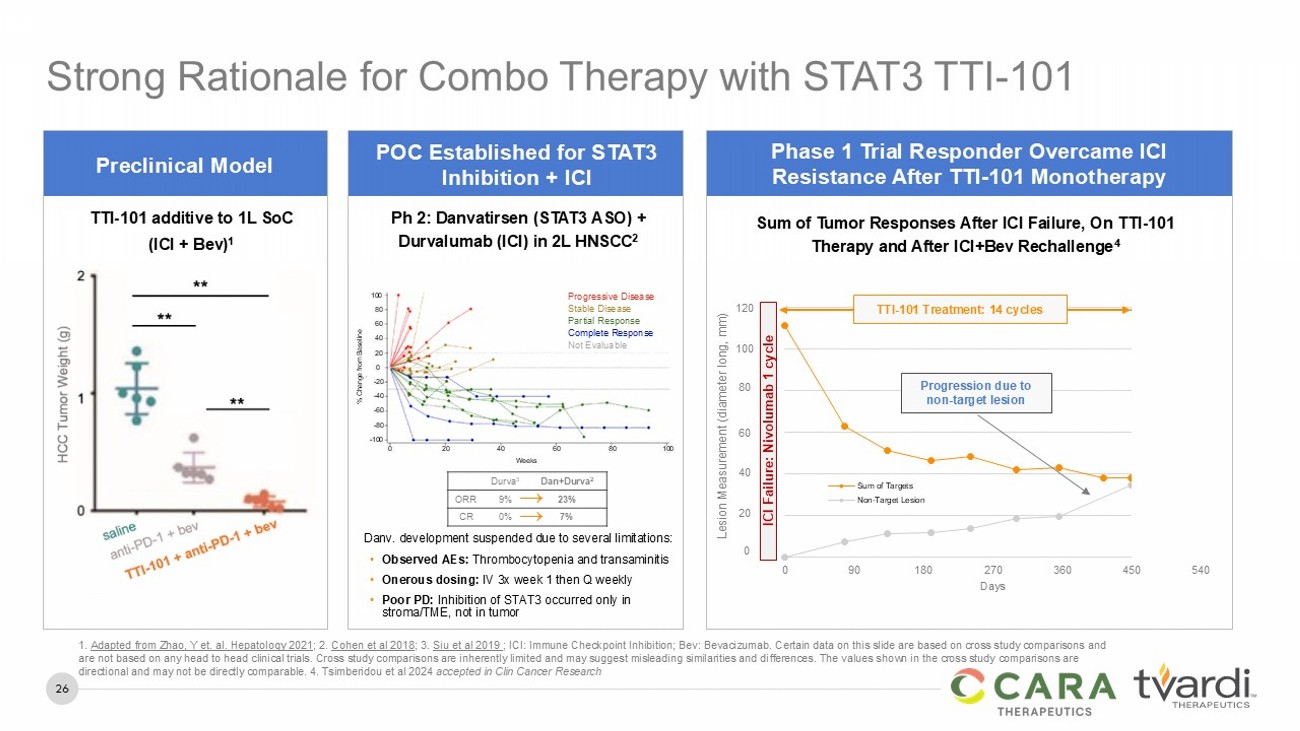 26 → → PH2:danvatirsen(STAT3 ASO)+ durvalumab(ICI)在2L HNSCC中从基线变化2% 0-20-40-60-80-100 20406080100020406080100020406080100周Danv。由于几个限制因素,开发暂停:•观察到的AEs:血小板减少和转氨炎•繁重的给药:静脉注射3x第1周,然后每周Q •不良PD:STAT3的抑制仅发生在基质/TME中,Not in tumor progressive disease stable partial response complete response not evaluable POC established for STAT3 inhibition + ICI strong rationalism for combo therapy with STAT3 TTI-101 Dan + durva 2 durva 323% 9% ORR 7% 0% CRTTI-101 additive to 1L SoC(ICI + BeV)1 preclinical model 020406080100120090180270360450540 days sum of targets non-target lesion progression due to non-target lesion due to non-target lesion new response ICI + Bev rechallenge sum of在TTI-101疗法和ICI + BeV再挑战后4020406080100120 ICI失败:nivolumab 1周期病变测量(直径长,mm)1期试验应答者在TTI-101单药疗法1后克服了ICI耐药。改编自Zhao,Y et. al. Hepatology 2021;2。科恩等2018;3。Siu et al 2019;ICI:Immune Checkpoint Inhibition;Bev:Bevacizumab。这张幻灯片上的某些数据是基于交叉研究比较,而不是基于任何头对头的临床试验。交叉研究的比较本质上是有限的,可能暗示了误导性的SIM不稳定性和差异。交叉研究比较中显示的值是方向性的,可能无法直接进行比较。4.Tsimberidou等人2024接受临床癌症研究TTI-101治疗:14个周期