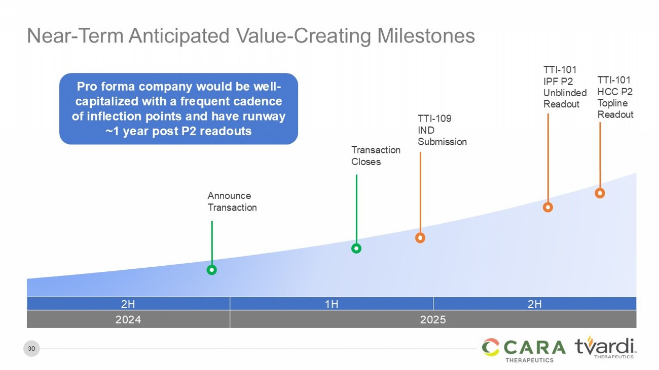 2免责声明和前瞻性陈述本演示文稿和任何随附的口头评论由Tvardi Therapeutics,Inc.(“Tvardi”)和Cara Th era Peutics,Inc.(“Cara”)编写,仅供参考,并协助此类各方自行评估Cara的全资子公司与Tvardi的潜在合并(“拟议合并”)和相关交易,而不是出于任何其他目的。除历史事实的陈述NTS外,本演示文稿和随附的口头评论中包含的所有陈述均为前瞻性陈述,包括:关于合并后公司对其候选产品的潜在益处、活性、有效性和安全性的预期的陈述;合并后公司对其研发计划、临床前研究和临床试验的设计和结果的预期,包括T imi ng和此类研究和试验数据的可用性;合并后公司对其候选产品的临床前、临床和监管开发计划,包括对合并后公司的候选产品进行监管备案和批准的时间或可能性;合并后公司对许可、获取、发现和开发additio nal候选产品并将这些候选产品推进并成功完成临床前研究和临床试验的能力的期望;合并后公司的候选产品和任何未来候选产品的潜在患者p opu lations的潜在市场规模和规模;维持现有的、建立新的、战略合作、许可的能力,或其他安排;保护合并后公司能够为涵盖其初始候选产品和任何未来候选产品的知识产权建立和维护的SCO PE;合并后公司的bu siness战略;合并后公司未来的经营业绩和财务状况;合并后公司对未来业绩的预期以及拟议合并的预期财务影响;对拟议合并的完成条件的满足以及拟议合并的完成时间,包括获得拟议的Mer ger的批准,以及Cara的股东由此设想的发行股票。这些陈述涉及大量已知和未知的风险、不确定性和其他因素,这些因素可能导致综合公司的实际结果、结果的时间安排、活动水平、业绩或成就与这些前瞻性状态ments所表达或暗示的信息存在重大差异。新的风险不时出现。TVardi和Cara的管理层无法预测所有风险,也无法评估所有因素对合并后公司业务的影响,或任何因素或因素组合可能在多大程度上导致实际结果与前瞻性陈述中预期或暗示的结果存在重大不利差异。Tvardi和Cara可能实际上并未实现其前瞻性陈述中披露的计划、意图或预期,并且您不应过分依赖此类前瞻性陈述。实际结果或事件可能与Tvardi和Cara发表的面向战争的声明中披露的计划、意图和预期存在重大差异。本演示文稿中的前瞻性陈述代表Tvardi和Cara截至本演示文稿发布之日的观点。Tvardi和Cara anti cip认为,随后的事件和发展将导致他们的观点发生变化。然而,尽管Tvardi和Cara可能会选择在未来某个时候更新这些前瞻性陈述,但除了适用法律要求的范围外,他们目前并没有这样做的打算。除法律要求外,Tvardi和Cara或任何其他人均不对本演示文稿及所附口头评论中的前瞻性陈述的准确性和完整性承担责任。因此,您不应依赖这些前瞻性陈述来代表Tvardi或Cara在本演示文稿日期之后的任何日期的观点。该演示文稿还包含独立方以及Tvardi和Cara就市场规模和增长以及有关合并后公司行业的其他数据所做的估计和其他统计数据。该数据涉及许多假设和限制,请注意不要对此类估计进行过度权衡。此外,对合并后公司未来业绩和经营所在市场未来业绩的预测、假设、估计必然具有高度的不确定性和风险性。此演示文稿包含商标、服务标记、 Tvardi、Cara和其他公司的商号和版权,它们是各自所有者的财产。本演示不应构成出售要约或购买这些证券的要约邀请,也不应是在根据任何此类州或司法管辖区的证券法进行注册或获得资格之前此类要约、邀请或出售将是非法的任何州或司法管辖区出售这些证券。