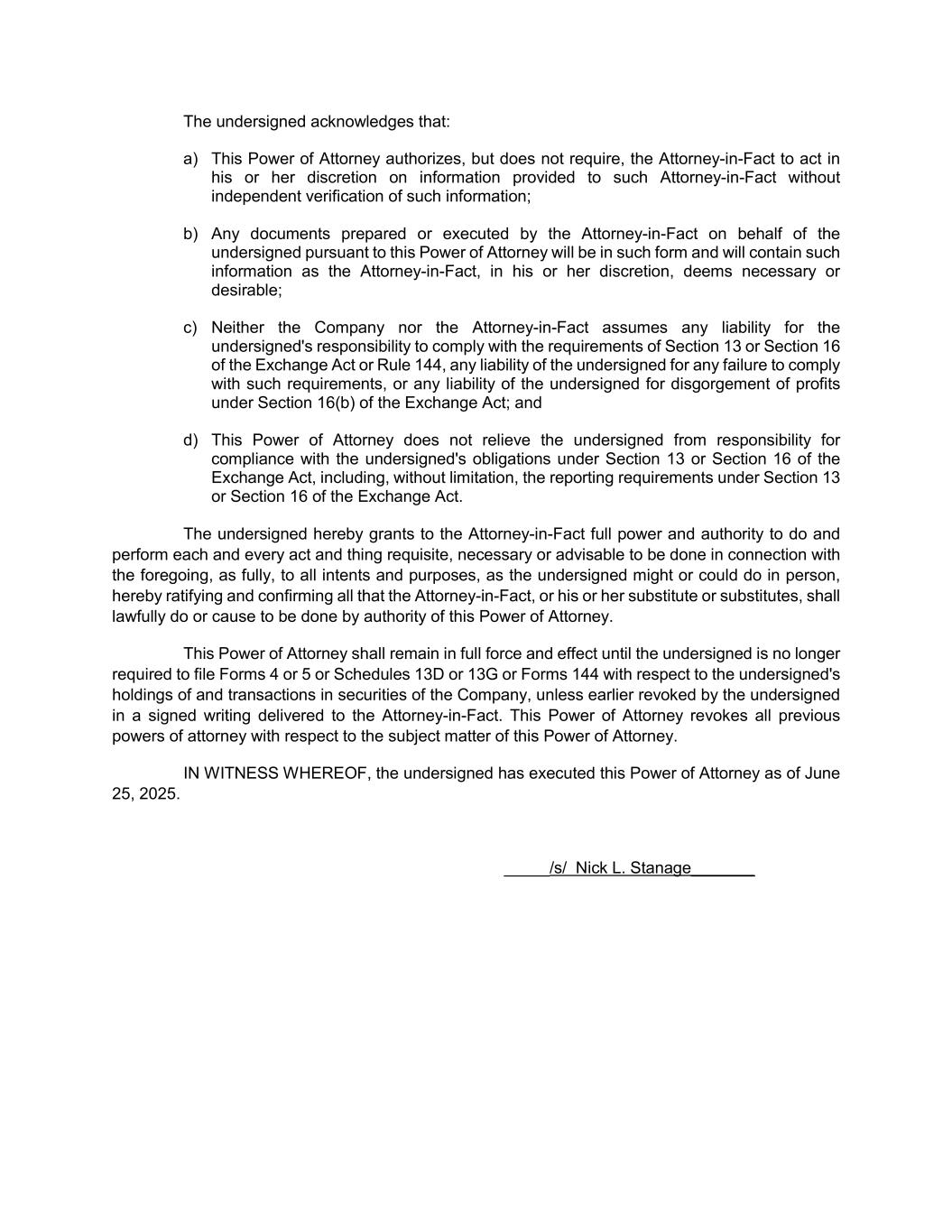 下列签署人承认:a)本授权书授权但不要求实际代理人就提供给该实际代理人的信息自行决定采取行动,而无需对这些信息进行独立核实;b)实际代理人根据本授权书代表以下签署人准备或签署的任何文件将采用其酌情决定的形式并将包含实际代理人等信息,认为必要或可取;c)公司或实际代理人均不对以下签署人遵守《交易法》第13条或第16条或第144条的要求的责任、以下签署人因未能遵守此类要求而承担的任何责任,或以下签署人根据《交易法》第16(b)条对利润的返还承担的任何责任承担任何责任;d)本授权书不免除以下签署人遵守《交易法》第13条或第16条规定的以下签署人义务的责任,包括但不限于,《交易法》第13条或第16条规定的报告要求。下列签署人特此授予实际代理人充分的权力和授权,以按照以下签署人可能或可能亲自做的所有意图和目的,尽可能充分地做和执行与上述有关的每一个必要、必要或可取的行为和事情,特此批准并确认实际代理人或其替代人或替代人凭本授权书的授权合法地做或安排做的所有事情。本授权书应保持完全有效,直至以下签署人不再被要求就以下签署人持有和交易公司证券提交表格4或5或附表13D或13G或表格144,除非以下签署人早些时候以交付给实际代理人的经签署的书面形式撤销。本授权书撤销此前所有与本授权书标的相关的授权书。下列签署人已于2025年6月25日签署本授权书,作为证明。_____/s/Nick L. Stanage ________
