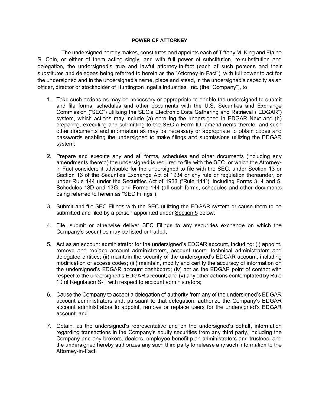 授权书下列签署人特此作出、组成及委任Tiffany M. King及Elaine S. Chin各自,或彼等中任何一人单独行事,并具有完全替代、重新替代及授权的权力,成为以下签署人的真实及合法的事实上的代理人(该等人及其替代人及受委托人在此称为“实际代理人”),全权代表以下签署人并以以下签署人的名义、地点和代替,以以下签署人作为Huntington Ingalls Industries, Inc.(“公司”)的高级职员、董事或股东的身份行事,以:1。采取可能必要或适当的行动,使以下签署人能够利用SEC的电子数据收集和检索(“EDGAR”)系统向美国证券交易委员会(“SEC”)提交和归档表格、时间表和其他文件,这些行动可能包括(a)让以下签署人加入EDGAR Next和(b)准备、执行和向SEC提交表格ID、对其的修订,以及可能必要或适当的其他文件和信息,以获得代码和密码,使以下签署人能够利用EDGAR系统进行归档和提交;2。根据1934年《证券交易法》第13条或第16条或任何规则或条例,或根据1933年《证券法》第144条(“第144条”),包括表格3、4和5、附表13D和13G以及表格144(所有此类表格、附表和其他文件在此称为“SEC文件”),准备并执行以下签署人必须向SEC提交的、或实际律师认为以下签署人向SEC提交的任何和所有表格、附表和其他文件(包括对其的任何修订);3。利用EDGAR系统向SEC提交和归档SEC文件,或促使根据下文第5条指定的人提交和归档;4。向公司证券可能上市或交易的任何证券交易所提交、提交或以其他方式交付SEC文件;5。担任以下签署人的EDGAR账户的账户管理员,包括:(i)任命、罢免和更换账户管理员、账户用户、技术管理员和受委托实体;(ii)维护以下签署人的EDGAR账户的安全性,包括修改访问代码;(iii)维护、修改和认证以下签署人的EDGAR账户仪表板上信息的准确性;(iv)担任与以下签署人的EDGAR账户相关的EDGAR联系点;以及(v)S-T条例第10条所设想的与账户管理员相关的任何其他行动;6。促使公司接受以下任何签署人的EDGAR账户管理员的授权,并根据该授权授权公司的EDGAR账户管理员为以下签署人的EDGAR账户指定、移除或替换用户;及7。作为以下签署人的代表并代表以下签署人从任何第三方(包括公司和任何经纪人、交易商、员工福利计划管理人和受托人)处获得有关公司股本证券交易的信息,以下签署人特此授权任何此类第三方向实际律师发布任何此类信息。