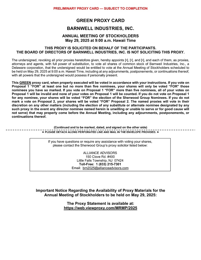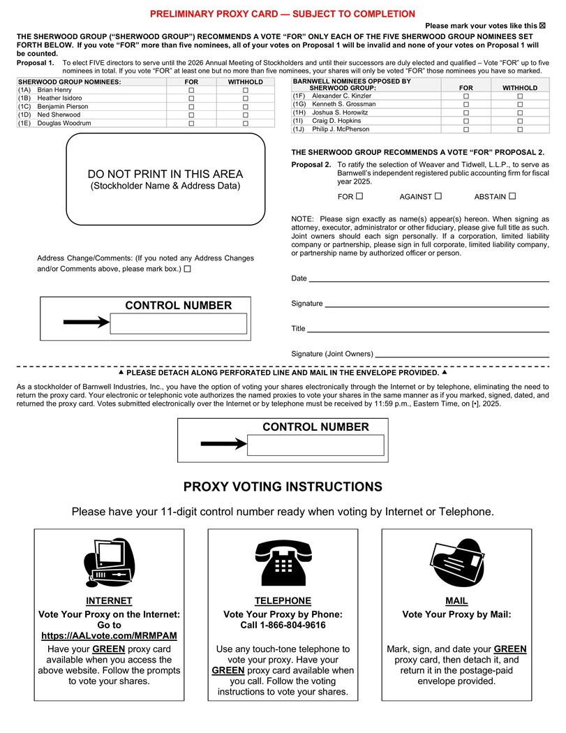 签名(共同所有人)请在所提供的信封内沿完成行和邮寄分离。作为Barnwell Industries, Inc.的股东,您可以选择通过互联网或电话以电子方式投票您的股份,无需归还代理卡。您的电子或电话投票授权指定的代理人以与您标记、签名、注明日期和退回代理卡相同的方式对您的股份进行投票。通过互联网或电话以电子方式提交的投票必须在晚上11点59分前收到。,美国东部时间,2025年[ • ]。不要在此区域打印(股东姓名和地址数据)初步代理卡—待完成后请这样标记您的投票SHERWOD集团(“SHERWOD集团”)建议仅对下面列出的五个SHERWOD集团提名人中的每一个进行投票“支持”。如投票“赞成”五名以上被提名人,则你对提案1的所有投票均无效,对提案1的投票均不计算在内。提案1。选举五名董事,任期至2026年年度股东大会,直至其继任者正式当选并符合资格——总共投票“支持”最多五名被提名人。如果你投票“支持”至少一位但不超过五位提名人,你的股票将只会被投票“支持”那些你如此标记的被提名人。SHERWOD集团提名人的保留:丨(1a)Brian Henry丨(1b)Heather Isidoro丨(1c)Benjamin Pierson丨丨(1d)Ned Sherwood丨(1e)Douglas Woodrum地址更改/评论:(如果您注意到上述任何地址更改和/或评论,请在方框中标记。)SHERWOD集团反对的Barnwell提名人的丨控制编号保留:丨(1f)丨Alexander C. Kinzler丨丨(1g)丨Kenneth S. Grossman Kenneth S. Grossman丨(1h)丨约书亚S.霍洛维茨Joshua S. Horowitz丨Alexander C. Kinzler(1i)Craig D. Hopkins丨提案2。批准选择Weaver和Tidwell,L. L. P.担任巴恩韦尔2025财年独立注册公共会计师事务所。for丨反对丨弃权丨注:请完全按照此处出现的姓名签名。在以律师、被执行人、管理人或其他受托人身份签字时,请提供完整的标题。共同所有人应各自亲自签字。如属法团、有限责任公司或合伙企业,请获授权人员或人士签署完整的法团、有限责任公司或合伙企业名称。日期签名标题控制号码代理投票说明网络或电话投票时请准备好您的11位控制号码。邮寄电话互联网邮寄投票给您的代理人:电话投票给您的代理人:致电1-866-804-9616在互联网上投票给您的代理人:前往https://AALvote.com/MRMPAM标记,签名,并在您的绿色代理卡上注明日期,然后将其拆下,并用提供的已付邮资的信封寄回。使用任何按键式电话为您的代理人投票。打电话时准备好绿色代理卡。按照投票指示投票表决你的股份。当您访问上述网站时,请准备好您的绿色代理卡。按照提示投票你的股份。