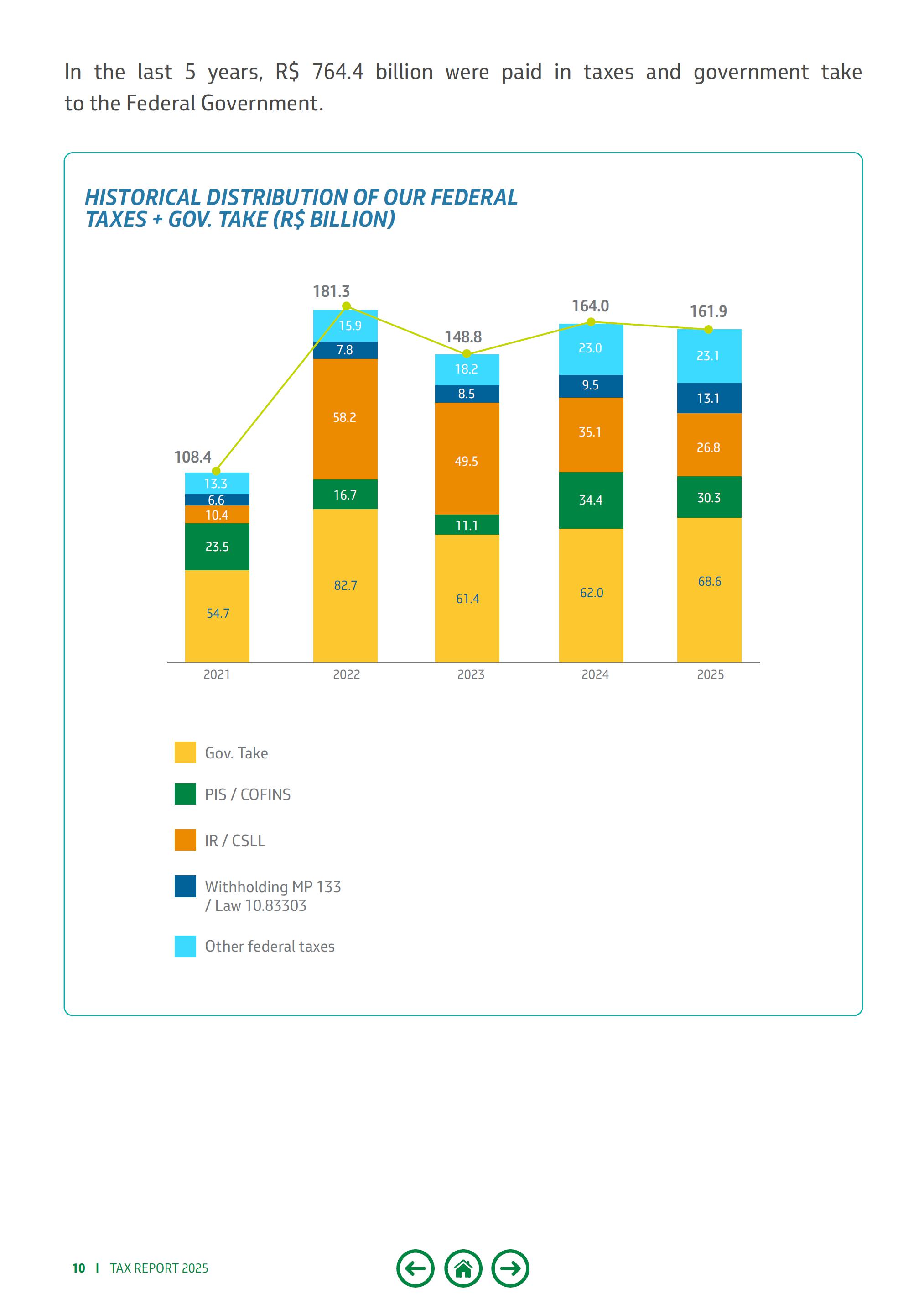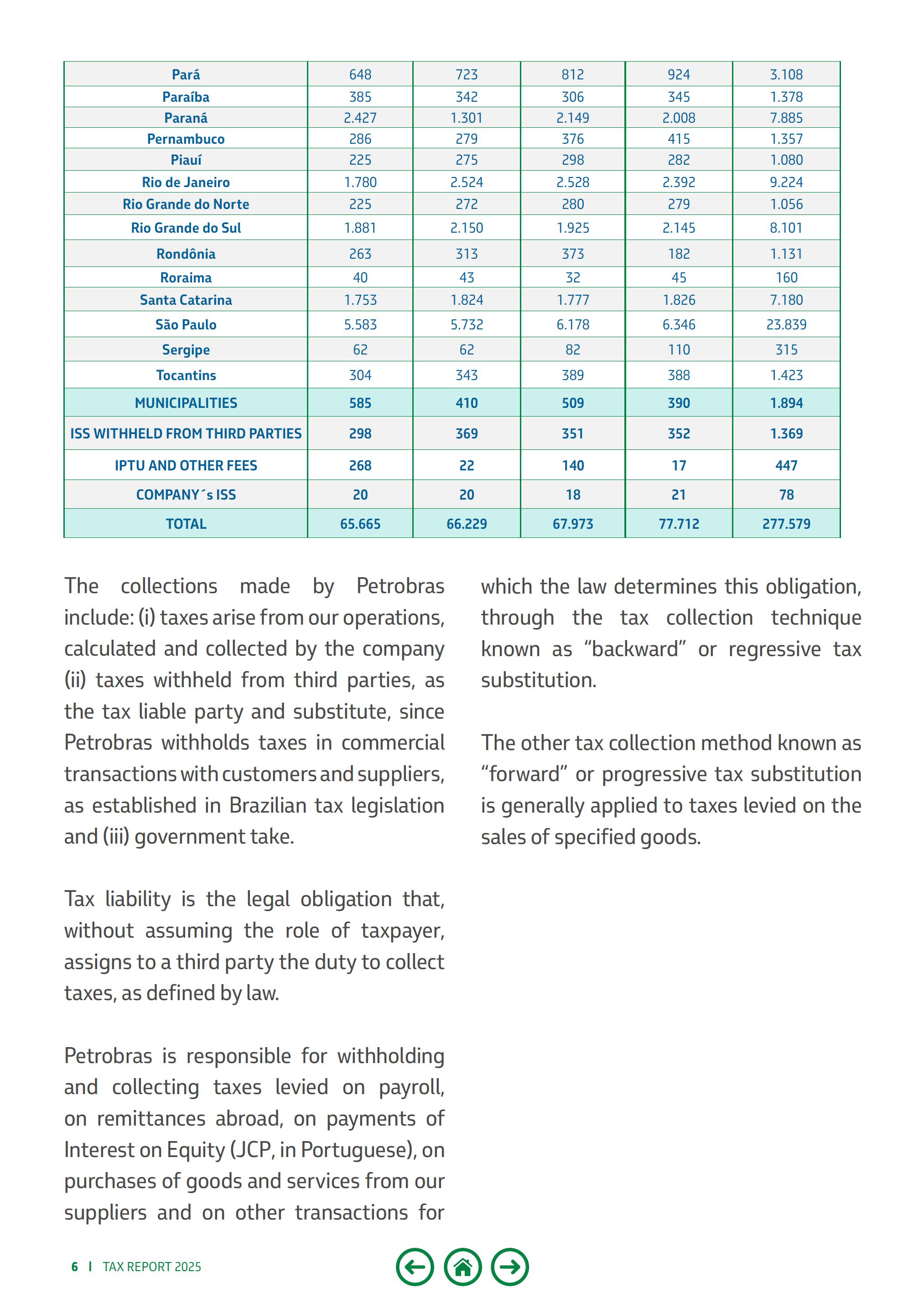 税务报告202505080911111316171820222424272931323333637消息来自首席执行官税收和政府采取由政府层面在巴西税收中支付的联邦税收国家税收在ICMS征收中石油的相关性和政府采取的州市政税收Government Take(GOV.Take)监管框架石油行业类型的政府。采取联邦税收优惠税收改革和IT巴西石油公司控制的公司缴纳的液化石油气价格税在巴西缴纳的税款国外合规和税收风险管理税收政策词汇表指数——来自首席执行官的消息——巴西石油公司很高兴地提交另一版财政报告,强调其通过缴纳税款和政府承担(Gov.take)对社会做出的重大贡献。这份文件提供了关于为各级政府征收的金额的详细信息,此外还描述了公司运营所处的税收环境以及税收如何影响燃料价格的细分。在过去五年中,该公司在巴西缴纳了超过1.3万亿雷亚尔的税款和Govern.Take,这一数额在联邦政府、各州、联邦区和市镇之间分配。2025年,仅在巴西,在现金制度下,为公共财政征收了2776亿雷亚尔的税款和Govern.Take。国外,巴西国家石油公司共收税4.4865亿美元。我们在巴西经济中扮演着非常重要的角色。目前,我们在22个州和128个市镇经营着477家分支机构,我们是巴西的主要纳税人。通过我们的纳税,我们有助于对社会产生积极影响,确保在卫生、教育、基础设施和安全等关键领域的投资获得更多资源。我们的税收管理以坚实的原则为指导,如道德、诚信、透明、效率和社会责任。这份报告反映了我们对社会和利益相关者的承诺,加强了我们作为国家发展的变革推动者的作用。我们致力于巩固巴西国家石油公司作为最佳的综合和多元化能源公司,重点是价值创造。这一承诺意味着为股东创造价值,并为巴西和我们经营所在的其他国家的发展创造价值。需要强调的是,2025年,巴西国家石油公司分配了超过452亿雷亚尔的股息和股权利息。这个数字表明了我们以可持续、高效、安全和负责任的方式创造财富的能力,加强了我们对社会的重大贡献。Magda Chambriard,Petrobras CEO Tax Report 2025 | 3个2776亿雷亚尔的税款+ Gov.take在巴西支付了452亿雷亚尔*作为股息分配4.4865亿美元的海外纳税*2025年,巴西石油公司批准了475亿雷亚尔的股息,已支付452亿雷亚尔。4 | Tax Report 2025 Taxes and Government Takes Payed in Brazil — 2025年,我们在巴西征收了2776亿雷亚尔作为税收和政府征收,占年度征收总额的3%, 与前一年相比。汇总表-巴西的税收和政府税收征收。Tax and Gov.TAKE(R $ million)1 º quarter 2 º quarter 3 º quarter 4 ° quarter total government TAKE 16.35015.4 4515.13621.66368.594 royalties 10.4569.73 110.2139.3 1039.711 special participation 5.66 35.71 44.92 35.24621.546 retention of area 230---230 signature bonus---7.1067.106 FEDERAL 22.62622.87 522.60525.18 793.293 IRPJ 6.34 24.2223.24 14.80 518.6 10 CSLL 2.56 21.92 21.4542.28 78.224 PIS/COFINS 4.89 47.82 48.66 98.89 230.279 witholding LAH2.03 91.52 39.333其他税收256208219298980州26.10 427.49929.72 330.472113.7 98英亩45455460204阿拉戈斯2952752553071.13 2 Amap á 78625961260 Amazonas 3223402152581.13 5 Bahia 1731872799391.578 Cear á 4546126125202.197 Distrito Federal 3644254124251.627 Esp í rito Santo 7228788909493.439 Goi á s 1.2851.75 11.89 51.90 56.83 5 Maranh ã o 1981302311164723马托格罗索1.5971.4571.8561.91 46.8 24南马托格罗索1.2601.32 81.43 31.2955.316米纳斯吉拉斯3.44 83.82 63.98915.291税务报告2025 | 5 Par á 6487238129243.108 Para í ba 3853423063451.378 Paran á 2.4271.30 12.14 92.0087.88 5伯南布哥2862793764151.357Piau í 222752982821.080里约热内卢1.7802.5242.5282.39 29.224北里奥格兰德2252722802791.056南里奥格兰德1.88 12.1501.9 252.1458.10 1龙多尼亚2633133731821.13 1罗赖马40433245160 Santa Catarina 1.75 31.82 41.77 71.8 267.180 S ã o Paulo 5.58 35.73 26.1786.34623.839 Sergipe 626282110315 Tocantins 3043433893881.423市政当局5854105093901.894 ISS从第三方扣留2983693513521.369 IPTU和其他费用2682214017447公司ISS 2020182178总计65.66 566.22 967.97 377.71 2277.579 Petrobras收取的款项包括:(i)我们的运营产生的税款,由公司计算和收取(ii)从作为纳税义务方和替代品的第三方预扣的税款,因为Petrobras在与客户和供应商的商业交易中预扣税款,如巴西税法规定和(iii)政府采取。纳税义务是法律界定的在不承担纳税人职责的情况下,将征税义务赋予第三人的法定义务。巴西国家石油公司负责通过被称为“倒推”或累退税收替代的税收征收技术,代扣代缴和征收对工资单、海外汇款、股权利息支付(JCP,葡萄牙语)、从我们的供应商购买商品和服务以及法律确定有此义务的其他交易征收的税款。另一种被称为“远期”或累进替代税的征税方式,一般适用于对特定商品销售征收的税款。6 | Tax Report 2025下图显示了历史上的税收和政府从Petrobras收取的款项,按政府级别细分。税收和政府支出(十亿雷亚尔)20242025雷亚尔收入毛额611.385万雷亚尔收入毛额627.424雷亚尔*Million S S S S R $ 26.2%有效税率R $ 25.62%有效税率S国家税收,而在各州,这一份额约对应征收总额的14%。这些数据强化了巴西国家石油公司作为巴西主要纳税人的地位。1资料来源:巴西联邦税务局、巴西国家财政部、各州透明度门户网站和CONFAZ。*2025年按权责发生制列报的母公司金额,巴西石油公司作为税收和政府拿走的平均每个工作日11亿雷亚尔,约占该国总收入的7%。在联邦一级,该公司贡献了6%的20212022202320242025202.9 279.0270,3277.62 40.29 3.596.5 104.91 13.89 0.2 1.0 1.1 1.4 1.9 1.25 3.8 98.7 102.09 3.387.454.78 2.76 1.46 2.068.6 PGOV联邦市政税