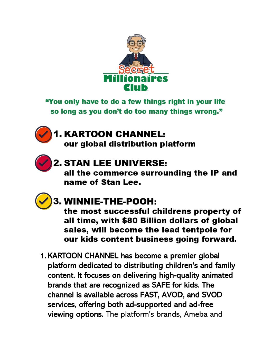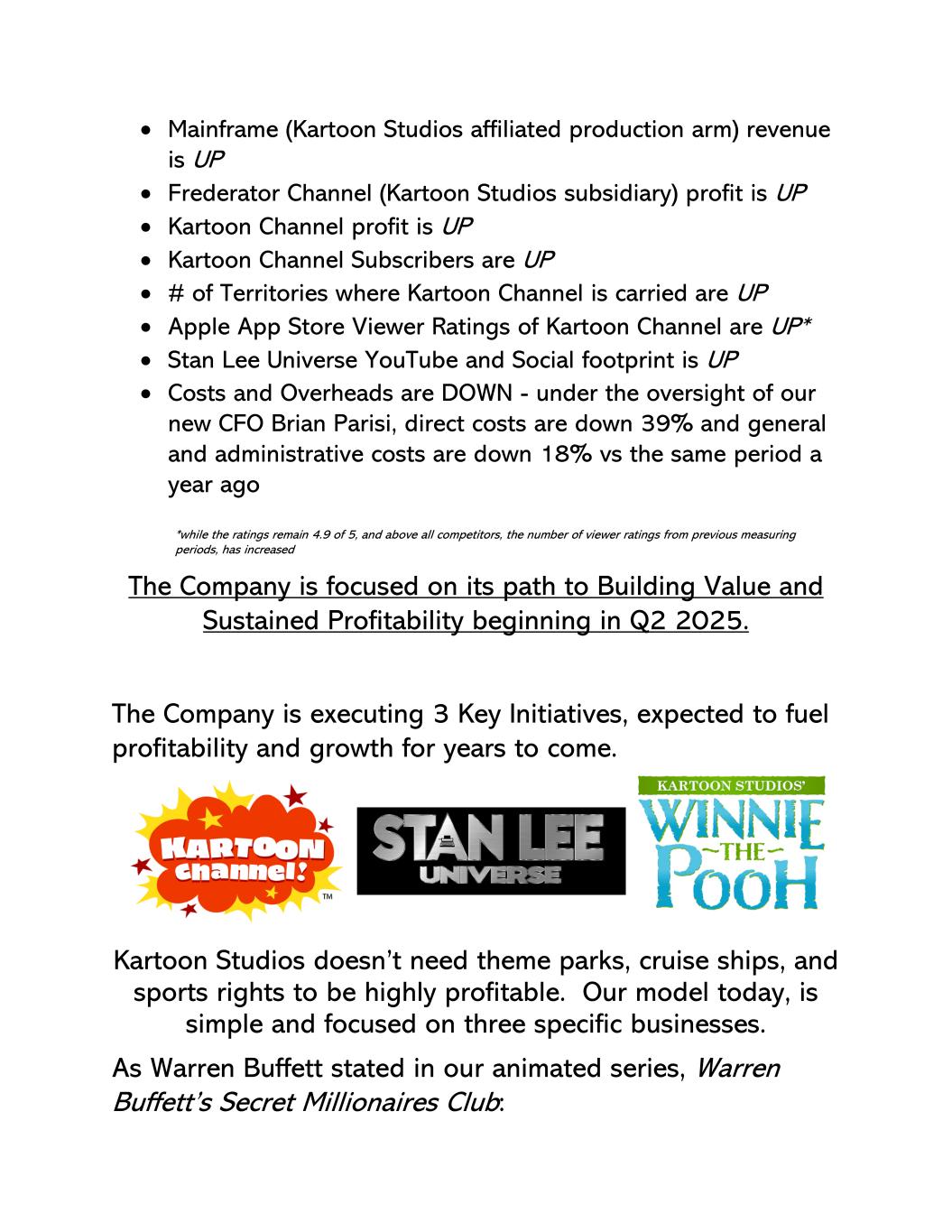• Mainframe(Kartoon Studios附属制作部门)收入上升• Frederator频道(Kartoon Studios子公司)利润上升• Kartoon频道利润上升• Kartoon频道订阅者人数上升•载有Kartoon频道的地区#上升• Kartoon频道的Apple App Store观众评分上升* • 李树忠丨YouTube和社交足迹上升•成本和间接费用下降-在我们新任首席财务官Brian Parisi的监督下,与去年同期相比,直接成本下降了39%,一般和行政成本下降了18% *,而收视率仍保持在4.9的5,而高于所有竞争对手的是,与之前的衡量时期相比,观众收视率的数量有所增加。该公司正专注于从2025年第二季度开始的建立价值和持续盈利能力的道路。该公司正在执行3项关键举措,预计将推动未来几年的盈利能力和增长。卡通工作室不需要主题公园、游轮、体育版权就能实现高利润。我们今天的模式,简单而专注于三个具体业务。正如沃伦·巴菲特在我们的动画系列中所说,沃伦·巴菲特的秘密百万富翁俱乐部:
