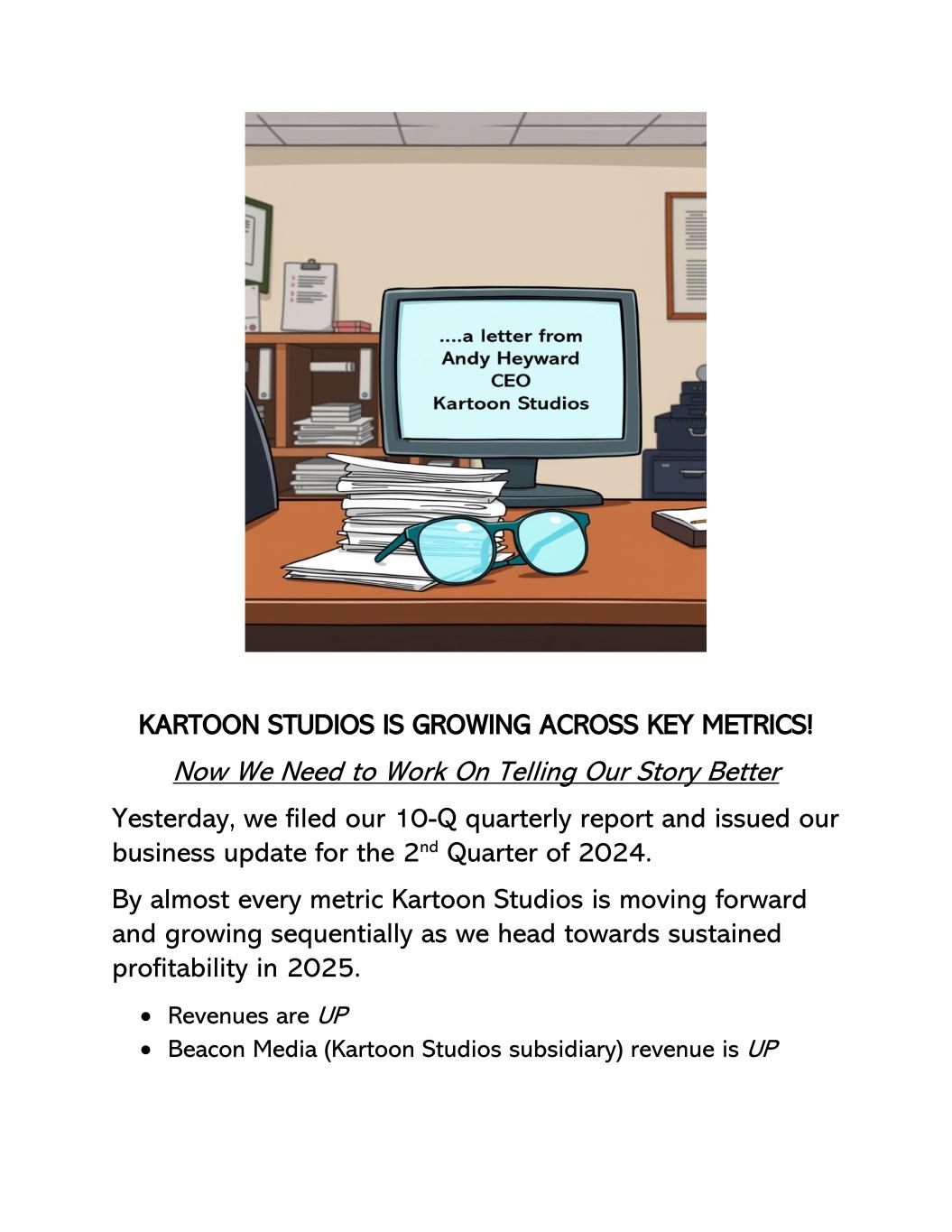 KARTOON STUDIOS在关键指标上不断增长!现在我们需要努力更好地讲述我们的故事昨天,我们提交了10-Q季度报告,并发布了2024年第二季度的业务更新。从几乎每一个指标来看,随着我们在2025年实现持续盈利,卡通工作室都在向前发展并连续增长。•营收向上• Beacon Media(Kartoon Studios子公司)营收向上