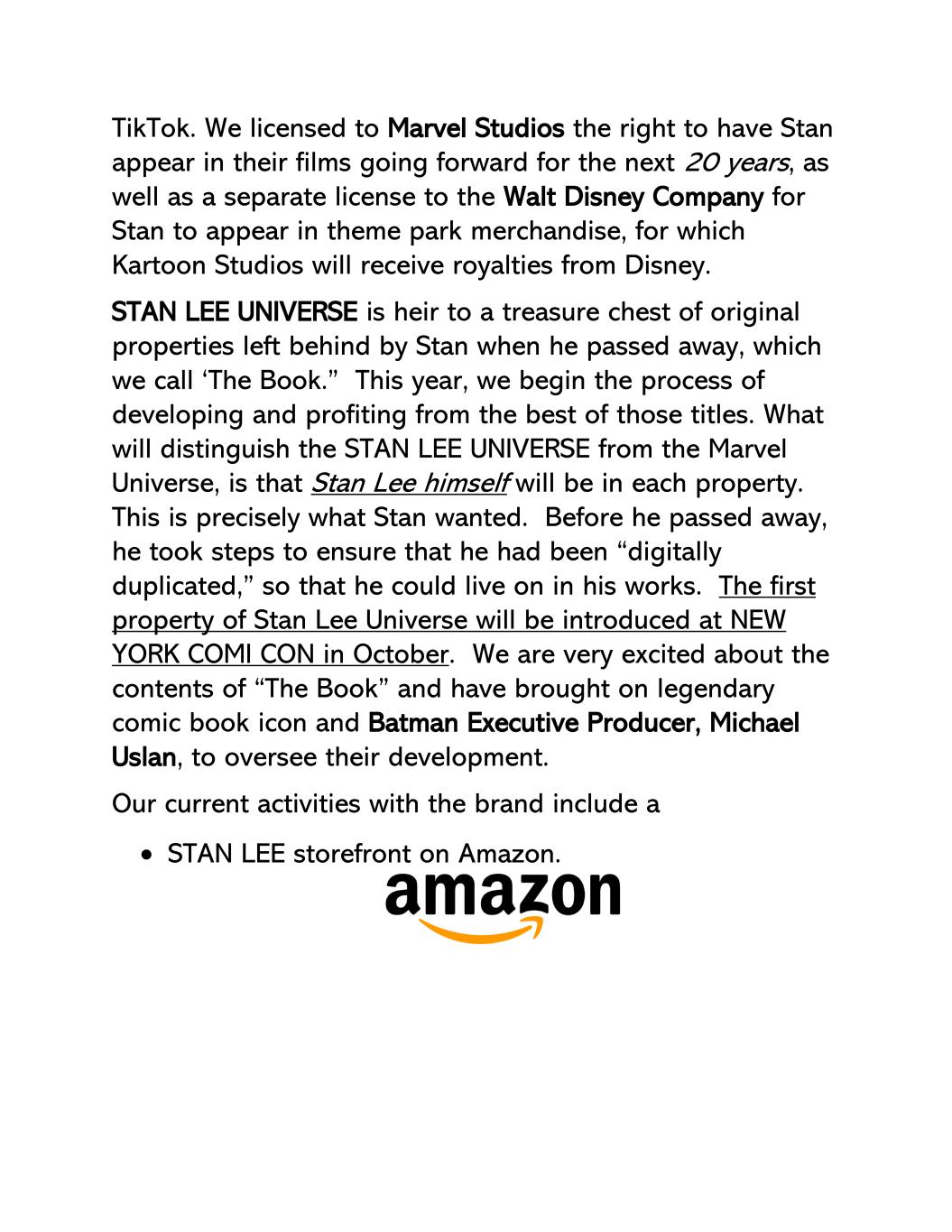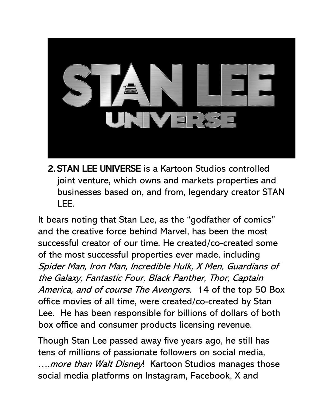 2.STAN LEE UNIVERSE是一家由Kartoon Studios控制的合资企业,拥有并销售基于传奇创作者STAN LEE并来自其的物业和业务。值得注意的是,作为“漫画教父”、漫威背后的创作力量,李树忠一直是我们这个时代最成功的创作者。他创造/共同创造了一些有史以来最成功的财产,包括蜘蛛侠、钢铁侠、不可思议的绿巨人、X战警、银河护卫队、神奇四侠、黑豹、雷神、美国队长,当然还有复仇者联盟。史上票房TOP50电影中有14部,由李树忠创作/联合创作。他负责了数十亿美元的票房和消费品授权收入。虽然李树忠五年前就去世了,但他在社交媒体上仍然拥有数千万热情的追随者,……比沃尔特迪斯尼还多!Kartoon Studios管理着Instagram、Facebook、X和