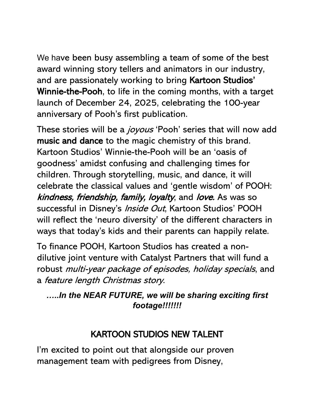 我们一直在忙于组建一支由我们行业中一些最优秀的获奖故事讲述者和动画师组成的团队,并正在充满激情地努力在未来几个月内让卡通工作室的小熊维尼栩栩如生,目标推出时间为2025年12月24日,庆祝维尼首次出版100周年。这些故事将是一个欢乐的‘维尼’系列,现在将为这个品牌的神奇化学添加音乐和舞蹈。在孩子们困惑和充满挑战的时代,卡通工作室的小熊维尼将成为‘善良的绿洲’。它将通过讲故事、音乐、舞蹈,颂扬POOH的古典价值观和‘温柔智慧’:善良、友谊、家庭、忠诚、爱。正如在迪士尼的Inside Out中所取得的成功一样,卡通工作室的POOH将以当今孩子和他们的父母能够愉快地联系的方式反映不同角色的‘神经多样性’。为了给POOH融资,卡通工作室与Catalyst Partners建立了一家不稀释的合资企业,该合资企业将为一系列稳健的多年剧集、节日特别节目和长篇圣诞故事提供资金。……在不久的将来,我们将分享激动人心的第一个镜头!!!!!!!KARTOON STUDIOS新才能我很高兴地指出,除了我们久经考验、拥有迪士尼血统的管理团队,