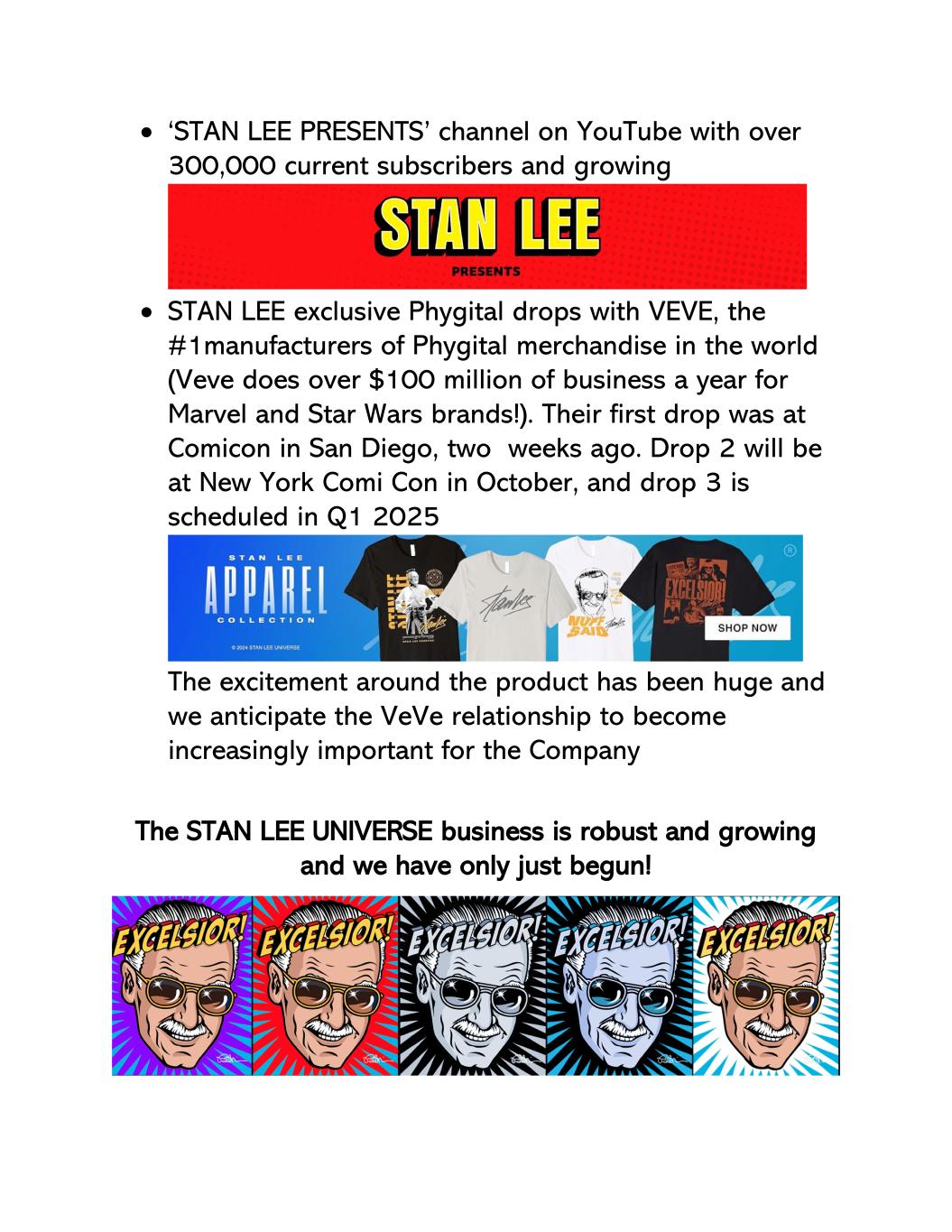 • YouTube上的‘STAN LEE Presents’频道目前拥有超过30万名订阅者,并且还在不断增长• STAN LEE与VEVE合作的独家Phygital Drops,是全球排名第一的Phygital商品制造商(Veve每年为漫威和星球大战品牌做超过1亿美元的业务!)。两周前,他们的第一次空降是在圣地亚哥的Comicon。Drop 2将于10月在纽约Comi Con上亮相,Drop 3定于2025年Q1围绕该产品的兴奋一直是巨大的,我们预计VEVE关系对公司来说将变得越来越重要。STAN LEE UNIVERSE业务稳健且不断增长,我们才刚刚开始!