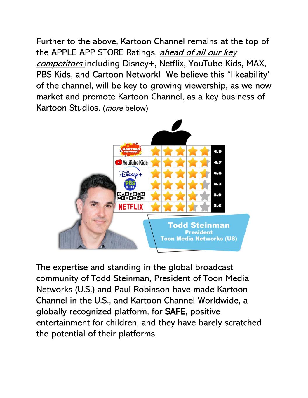 更进一步,Kartoon频道保持在苹果APP Store评分的首位,领先于我们所有的主要竞争对手,包括Disney +、Netflix、YouTube Kids、MAX、PBS Kids和Cartoon Network!我们认为,该频道的这一“可喜性”,将是增加收视率的关键,因为我们现在营销和推广卡通频道,作为卡通工作室的一项关键业务。(下文更多)Toon Media Networks(美国)总裁Todd Steinman和Paul Robinson在全球广播社区的专长和地位,让美国的Kartoon Channel,以及全球公认的儿童安全、正向娱乐平台Kartoon Channel Worldwide,都勉强刮到了各自平台的潜力。