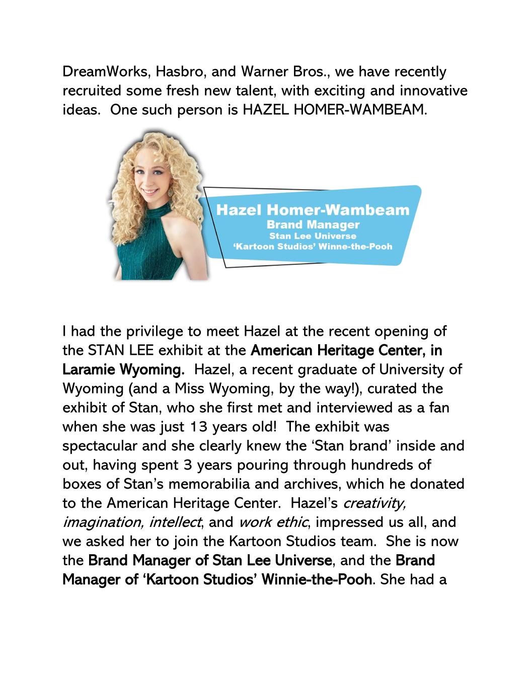 梦工厂、孩之宝、华纳兄弟,我们最近招募了一些新鲜的新人,有令人兴奋和创新的想法。Hazel HOMER-WAMBEAM就是这样一个人。我有幸在最近于怀俄明州拉勒米市美国遗产中心举办的STAN LEE展览开幕式上见到了Hazel。Hazel,怀俄明大学的应届毕业生(顺便说一句,也是怀俄明小姐!),策划了Stan的展览,她在13岁时作为粉丝第一次遇到并采访了他!展览非常壮观,她清楚地知道‘斯坦品牌’的内在和外在,她花了3年时间翻阅了数百箱斯坦的纪念品和档案,这些都是他捐赠给美国遗产中心的。Hazel的创造力、想象力、智慧和职业道德,给我们所有人留下了深刻印象,我们邀请她加入卡通工作室团队。她现在是李树忠大自然药业品牌经理,以及‘卡通工作室’小熊维尼品牌经理。她有一个