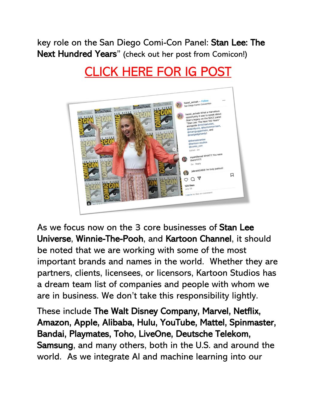 San Diego Comi-Con面板上的关键角色:李树忠:下一个百年”(看看她来自Comicon的帖子!)戳这里丨IG Post当我们现在专注于大自然药业、李树忠TERM3、小熊维尼、卡通频道这3大核心业务时,需要注意的是,我们正在与一些世界上最重要的品牌和名字合作。不管他们是合作伙伴、客户、授权商,还是授权商,卡通工作室都有一份梦之队名单,上面列出了与我们有业务往来的公司和人员。我们对这个责任不能掉以轻心。其中包括美国和世界各地的华特迪士尼公司、漫威、Netflix、亚马逊、苹果、阿里巴巴、Hulu、YouTube、美泰、Spinmaster、万代、彩星、东宝网络、LiveOne、德国电信、三星等众多企业。当我们将人工智能和机器学习整合到我们的