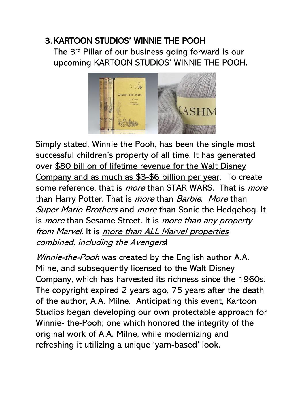 3.KARTOON STUDIOS的WINNIE the POOH我们未来业务的第三个支柱是我们即将推出的KARTOON STUDIOS的WINNIE the POOH。简单地说,小熊维尼,一直是有史以来最成功的儿童财产。它为华特迪士尼公司创造了超过800亿美元的终生收入,每年高达30-60亿美元。创造一些参考,那不仅仅是星球大战。这比哈利波特还多。这比芭比娃娃还多。不止是超级马里奥兄弟,不止是刺猬索尼克。不止是芝麻街。它比漫威的任何财产都重要。它比所有漫威属性加起来还多,包括复仇者联盟!Winnie-the-Pooh由英国作家A.A. Milne创作,随后授权给了从上世纪60年代开始收获财富的华特迪士尼公司。版权在2年前到期,距作者A.A. Milne去世75年。预见到这一事件,卡通工作室开始为小熊维尼开发我们自己的可保护方法;该方法尊重A.A. Milne原作的完整性,同时利用独特的“基于纱线”的外观对其进行现代化和刷新。