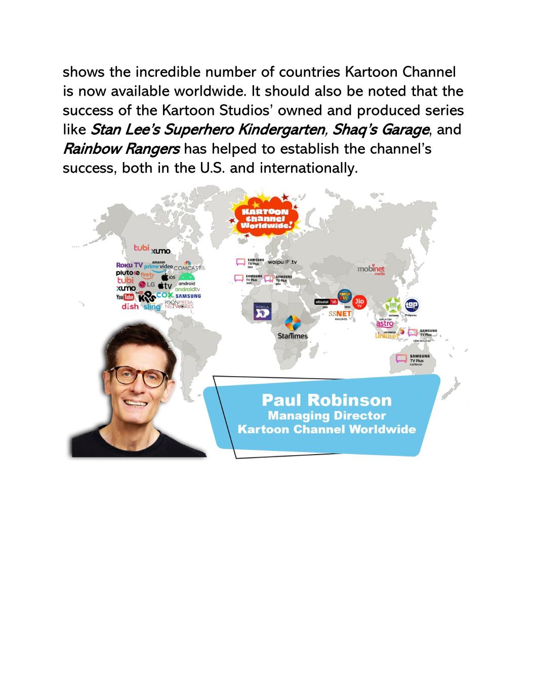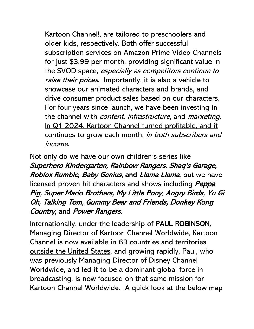 卡通频道!,分别为学龄前儿童和年龄较大的孩子量身定制。两者都在亚马逊Prime视频频道上提供成功的订阅服务,每月仅需3.99美元,为SVOD领域提供了巨大的价值,尤其是在竞争对手不断提高价格的情况下。重要的是,它也是展示我们的动画角色和品牌的工具,并根据我们的角色推动消费品销售。自推出以来的四年里,我们一直在通过内容、基础设施和营销对渠道进行投资。2024年第一季度,卡通频道转为盈利,并且每个月都在继续增长,无论是订阅人数还是收入。我们不仅有自己的儿童系列,如超级英雄幼儿园、彩虹巡游者、沙克的车库、Roblox隆隆声、天才宝贝、骆驼骆驼,而且我们还授权了经过验证的热门角色和节目,包括小猪佩奇、超级马里奥兄弟、我的小马驹、愤怒的小鸟、游戏Gi Oh、会说话的汤姆、小熊和朋友们、大金刚国家、电力别动队。国际方面,在Kartoon Channel Worldwide董事总经理PAUL ROBINSON的领导下,Kartoon Channel现已在美国以外的69个国家和地区上线,并快速增长。保罗此前曾担任迪士尼全球频道的董事总经理,并带领该频道成为广播领域的全球主导力量,现在他正专注于卡通全球频道的同样使命。快速浏览下图