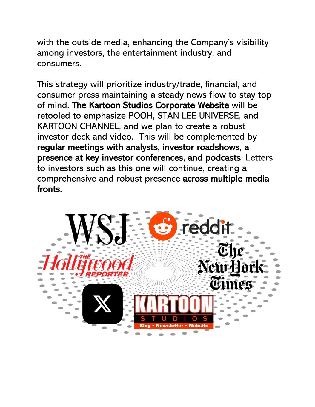 与外界媒体,提升公司在投资者、娱乐行业、消费者中的知名度。这一策略将优先考虑行业/贸易、金融和消费者媒体保持稳定的新闻流,以保持首要地位。Kartoon Studios公司网站将重新调整,以强调POOH、STAN LEE UNIVERSE和KARTOON CHANNEL,我们计划创建一个强大的投资者卡组和视频。这将辅之以与分析师的定期会议、投资者路演、关键投资者会议的出席以及播客。像这封信这样的致投资者的信将继续,在多个媒体战线上创造一个全面而强大的存在。
