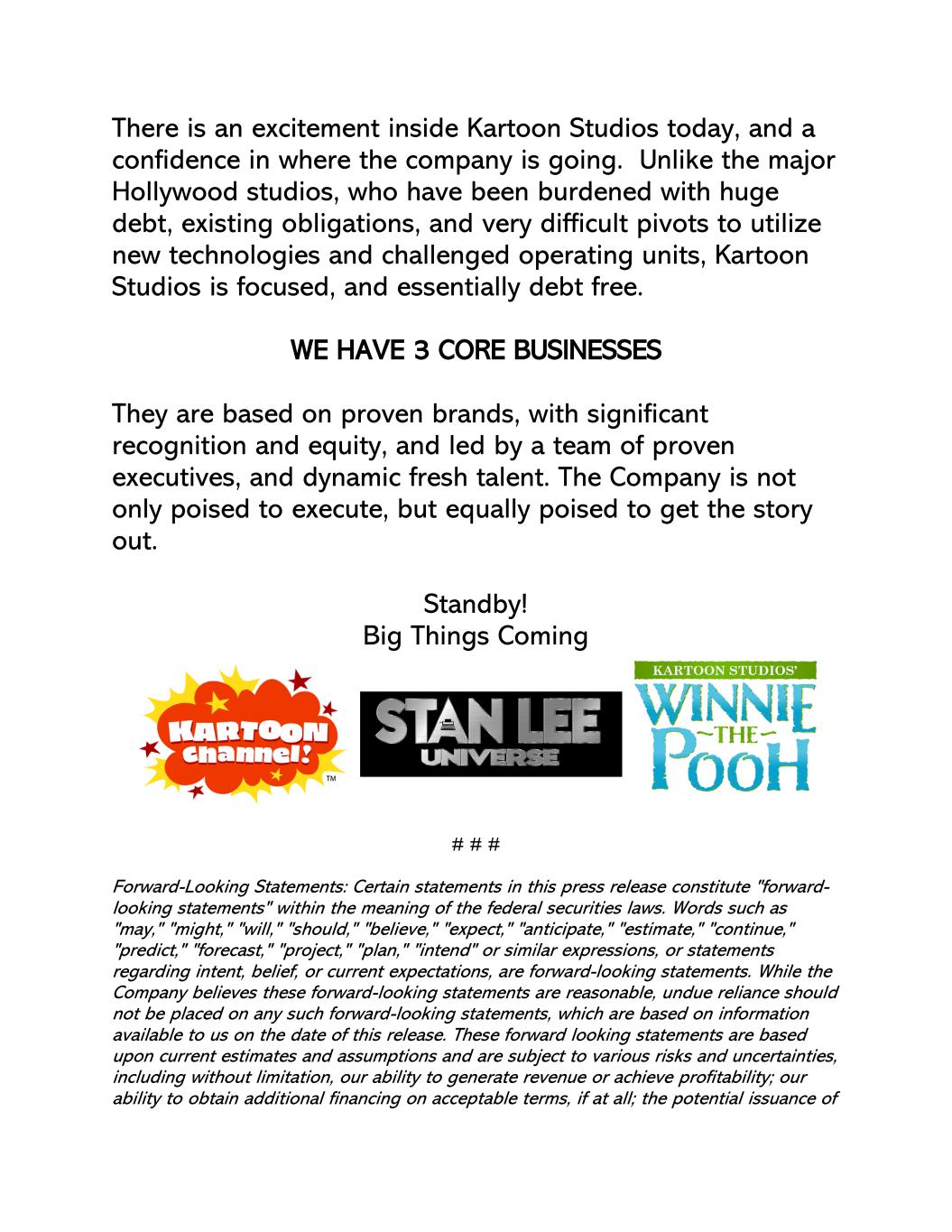 今天卡通制片公司内部有一种兴奋,一种对公司走向的信心。与好莱坞各大制片公司不同,它们背负着巨额债务、现有义务,以及利用新技术和挑战运营单位的非常困难的支点,卡通制片公司是专注的,基本上没有债务。我们有3个核心业务它们基于经过验证的品牌,具有显著的认可度和公平性,并由经过验证的高管团队领导,以及充满活力的新鲜人才。该公司不仅准备好执行,而且同样准备好把故事讲出来。待命!大事来了# # #前瞻性陈述:本新闻稿中的某些陈述构成联邦证券法含义内的“前瞻性陈述”。诸如“可能”、“可能”、“将”、“应该”、“相信”、“预期”、“预期”、“估计”、“继续”、“预测”、“预测”、“项目”、“计划”、“打算”或类似表述,或有关意图、信念或当前预期的陈述,均为前瞻性陈述。尽管公司认为这些前瞻性陈述是合理的,但不应过分依赖任何此类前瞻性陈述,这些陈述基于我们在本新闻稿发布之日可获得的信息。这些前瞻性陈述基于当前的估计和假设,并受到各种风险和不确定性的影响,包括但不限于我们产生收入或实现盈利的能力;我们以可接受的条款获得额外融资的能力(如果有的话);潜在的发行