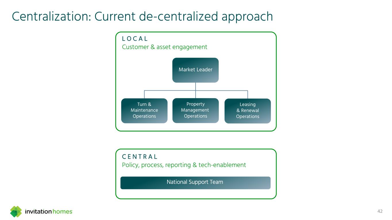 集中化:当前的去集中化方法42市场领导者周转和维护运营物业管理运营租赁和更新运营国家支持团队L O C A L客户和资产参与C E N T R A L政策、流程、报告和技术支持