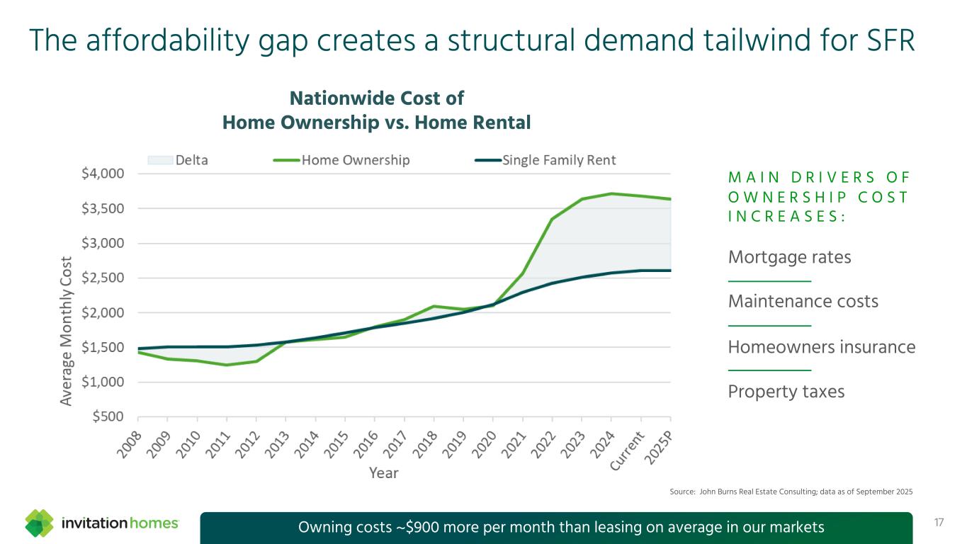 负担能力差距为SFR 17创造了结构性需求顺风全国房屋拥有成本vs.房屋租赁来源:John Burns房地产咨询;截至2025年9月的数据M A I N D R I V E R S O F O W W E R H I P C O S T I N C R E A S E S:抵押贷款利率维护成本房主保险财产税拥有成本每月比租赁平均多约900美元在我们的市场上