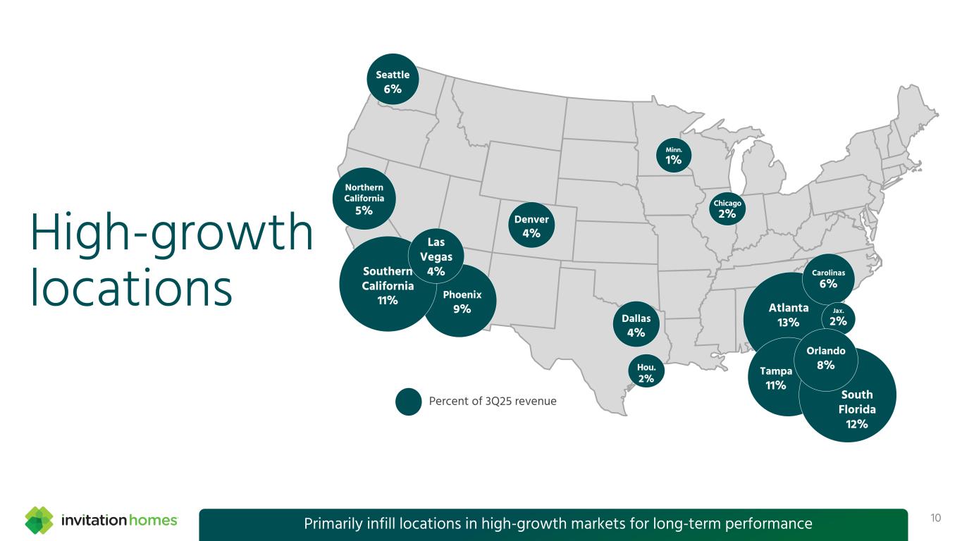 高增长地点占3Q25收入的百分比西雅图6%明尼苏达州1%丹佛4%达拉斯4%凤凰城9%亚特兰大13%坦帕11%南加州11%拉斯维加斯4%南佛罗里达12%北加州5%卡罗莱纳6% Jax。2%奥兰多8%侯。2%芝加哥2% 10主要在高增长市场填充位置以获得长期业绩