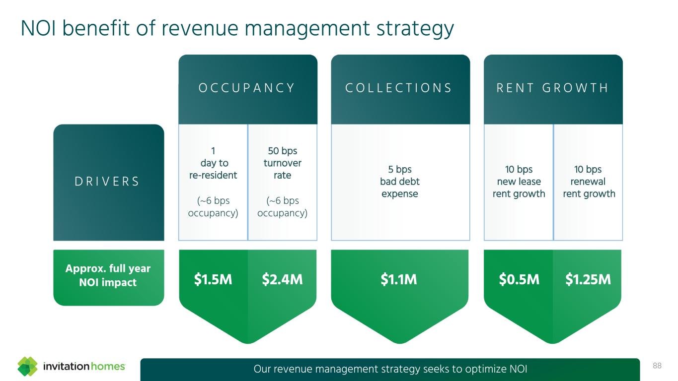 定义&调节99净营业收入(NOI)NOI是一种非GAAP衡量标准,通常用于评估房地产公司的业绩。我们将已确定的房屋人口的NOI定义为租金收入和其他财产收入减去财产运营和维护费用(主要包括财产税、保险、HOA费用(如适用)、市场层面的人员费用、维修和维护、租赁成本和营销费用)。NOI不包括:利息费用;折旧和摊销;物业管理费用;一般和行政费用;减值和其他;出售物业的收益,税后净额;股本证券投资的(收益)损失,净额;其他收入和支出;管理费收入;以及对未合并的合资企业的投资(收入)损失。与NOI最直接可比的GAAP衡量标准是净收益或亏损。NOI不被用作流动性的衡量标准,不应被视为净收入或亏损或根据公认会计原则提出的任何其他财务业绩衡量标准的替代方法。由于并非所有公司都使用相同的NOI定义,我们的NOI可能无法与其他公司的NOI进行比较。因此,无法保证我们计算这一非GAAP衡量标准的基础与其他公司的基础具有可比性。我们认为,出于与NOI相同的原因,同店NOI也是对我们经营业绩的一种有意义的补充衡量,并且对投资者有进一步的帮助,因为它通过在我们的同店组合中反映房屋的NOI,为我们在报告期间的业绩提供了更一致的衡量。有关我们总投资组合的GAAP净收入与NOI以及同店投资组合的NOI的对账,请参阅“净收入与同店NOI的对账”。租金增长率任何房屋的租金增长率代表到期租约的月租金与下一次租约的月租金之间的百分比差异,在每种情况下,反映任何摊销的非服务租金优惠和摊销的合同租金增加的影响。租赁要么是续租,我们现在的居民选择在接下来的租期内继续居住,要么是新的租赁,我们以前的居民搬出去,新的居民签署租约,占用同一个家。同店/同店组合同店或同店组合包括,在给定报告期内,已稳定和经过调整的完全拥有的房屋,不包括已售出的房屋、已确定出售给自住人并已空置的房屋、因伤亡损失事件或不可抗力而被视为无法运营或严重受损的房屋、在组合交易中获得的被视为未经历与我们现有同店组合足够相似的质量和特征的翻新的房屋,以及我们已宣布有意退出的市场中的住宅,在这些市场中我们不再经营大量住宅。