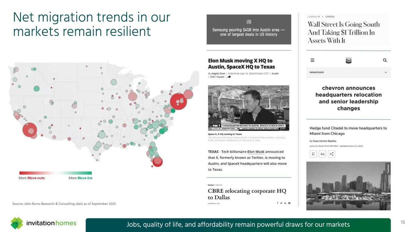 千禧一代和Z世代推动了对单户住宅出租的长期需求15Over 1.3万人预计未来10年每天都将年满35岁-3M-2M-1M 0M 1M 2M 2M 3M 4M年龄0 – 4年龄5 – 9年龄10 – 14年龄15 – 19年龄20 – 24年龄25 – 29年龄30 – 34年龄35 – 39年龄40 – 44年龄45 – 49年龄50 – 54年龄55 – 59年龄60 – 64年龄65 – 69美国10年按年龄组划分的净人口变化(2025-2034)I N V H S W E T S P O T新居民平均年龄:39岁资料来源:John Burns研究咨询,美国人口普查局人口估计和国会预算办公室预测表格,2025年9月发布