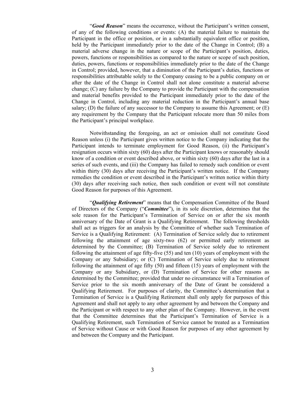 3“正当理由”是指在未经参与者书面同意的情况下发生以下任何情况或事件:(a)未能在紧接控制权变更日期之前维持参与者在其所担任的职位或职位,或在实质上相当的职位或职位;(b)与紧接控制权变更日期之前的该职位、职责、权力、职能或责任的性质或范围相比,该参与者的职位、职责、权力、职能或责任的性质或范围发生重大不利变化;前提是,但是,在控制权变更之日或之后仅归属于不再是公众公司的参与者的职责、职能或责任的减少,不应单独构成重大不利变化;(c)公司未能向参与者提供在紧接控制权变更之日前向参与者提供的补偿和重大利益,包括对参与者年基本工资的任何实质性削减;(d)公司的任何继任者未能承担本协议;或(e)公司要求参与者搬迁至距参与者主要工作场所50英里以上的任何要求。尽管有上述规定,除非(i)参与者向公司发出书面通知,表明该参与者打算以良好理由终止雇佣关系,(ii)参与者的辞职发生在参与者知道或合理地应该知道上述条件或事件后的六十(60)天内,或在一系列此类事件中的最后一次之后的六十(60)天内,以及(iii)公司未能在收到参与者的书面通知后的三十(30)天内补救该条件或事件。如果公司在收到该通知后三十(30)天内对参与者书面通知中描述的条件或事件进行补救,则该条件或事件将不构成本协议的良好理由。「合资格退休」指公司董事会薪酬委员会(「委员会」)全权酌情决定,参与者于授出日期六个月周年或之后终止服务的唯一原因为合资格退休。以下阈值应作为委员会分析该终止服务是否为合格退休的触发器:(a)仅因年满六十二(62)岁后退休或委员会确定的允许提前退休而终止服务;(b)仅因年满五十五(55)岁及在公司或任何附属公司受雇十(10)年后退休而终止服务;或(c)仅因年满五十(50)岁后退休而终止服务及在公司或任何附属公司受雇十五(15)年,或(d)因委员会决定的其他理由而终止服务;但在任何情况下,在授出日期六个月周年之前终止服务均不会被视为合资格退休。为清楚起见,委员会关于终止服务为合资格退休的决定仅适用于本协议的目的,而不适用于公司与参与者之间的任何其他协议或与公司的任何其他计划有关的任何其他协议。然而,如果委员会确定参与者的终止服务为合资格退休,则该终止服务不能被视为公司与参与者之间的任何其他协议的目的的无故或有充分理由的终止服务。
