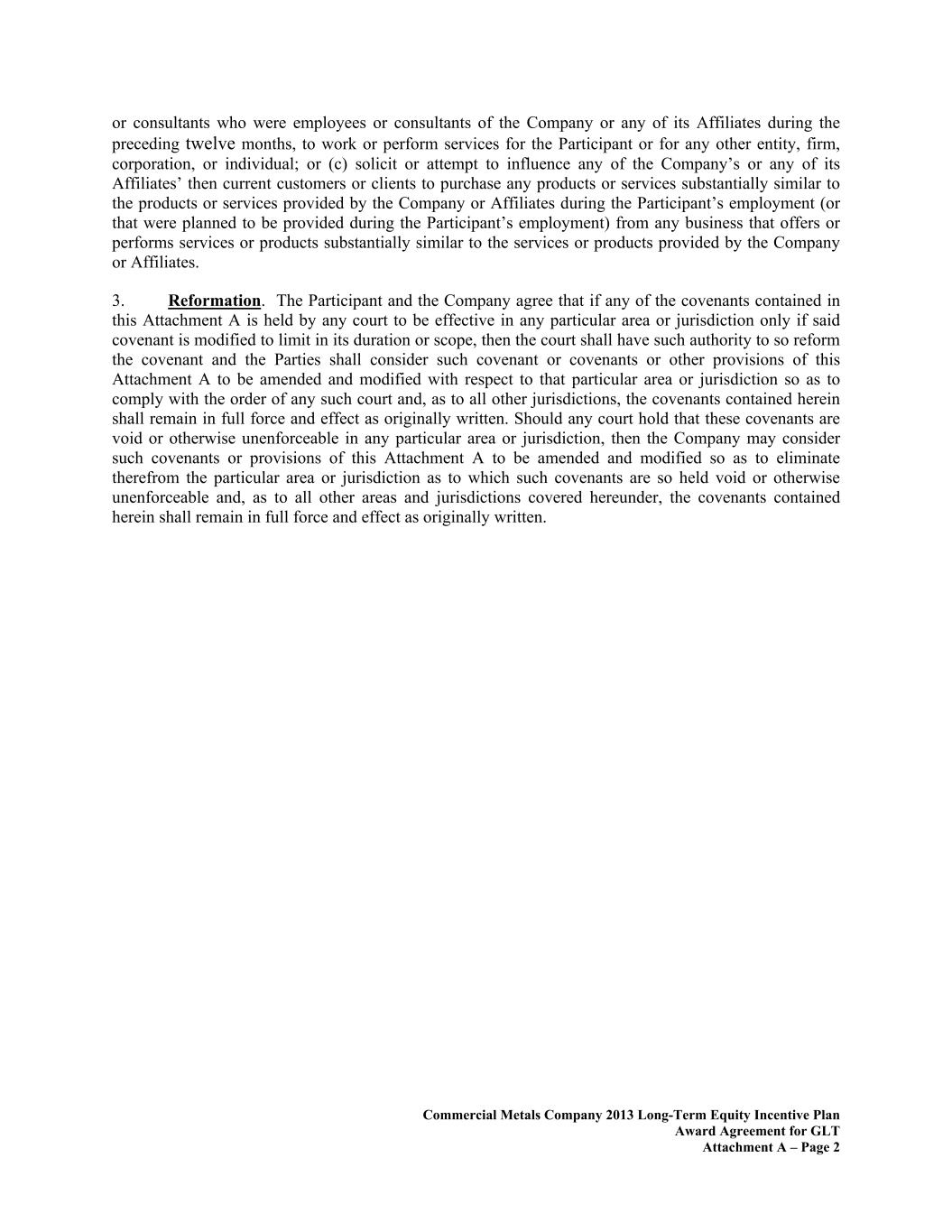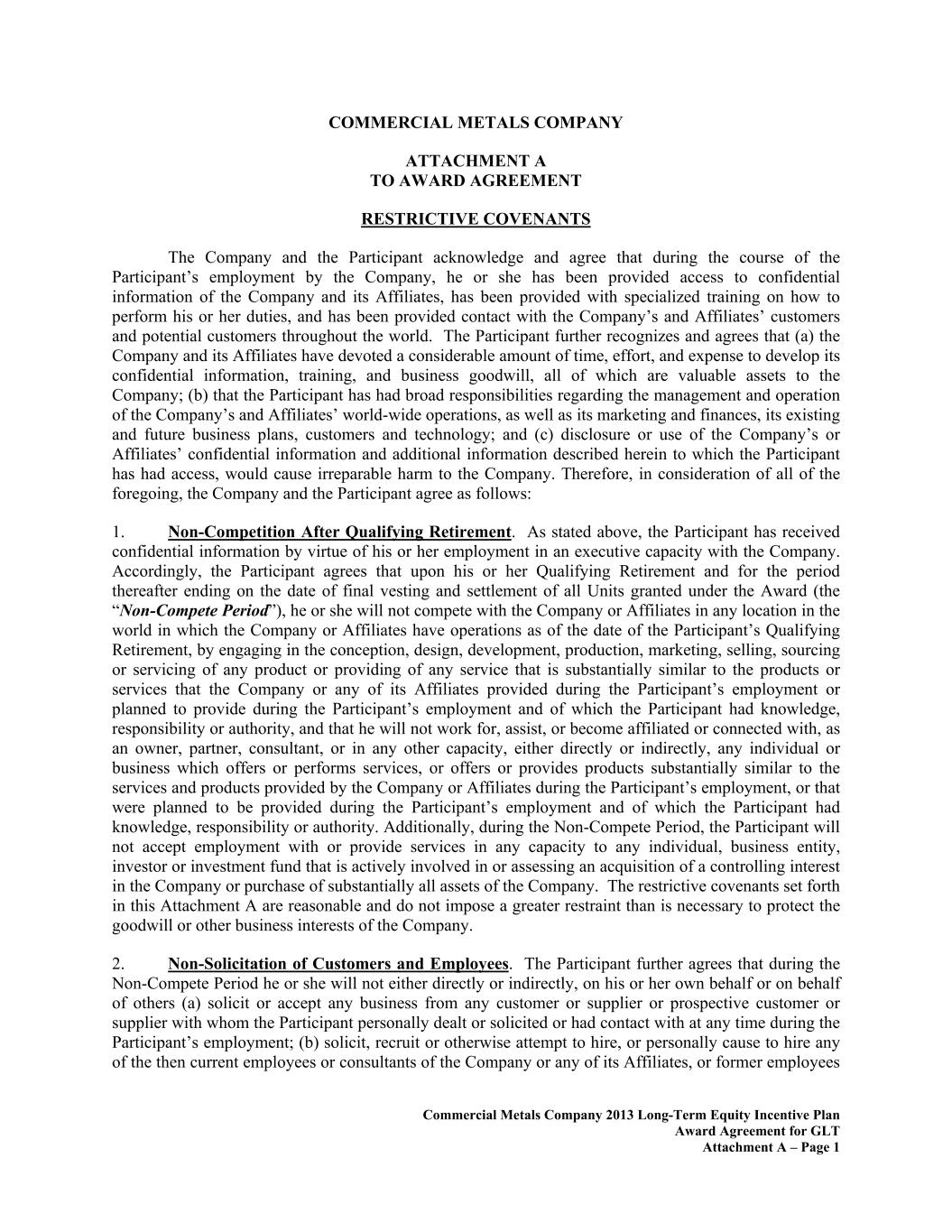 GLT2013年长期股权激励计划授予协议之TERM1附 A –第1页商业金属公司附件A至授予协议限制性公约公司与参与者承认并同意,在参与者被公司聘用的过程中,其获得了公司及其关联公司机密信息的访问权限,接受了如何履行职责的专门培训,并获得了与公司及关联公司客户以及全球各地潜在客户的联系。参与者进一步承认并同意:(a)公司及其关联公司投入了大量的时间、精力和费用来开发其机密信息、培训和商业商誉,所有这些都是公司的宝贵资产;(b)参与者对公司和关联公司的全球运营的管理和运营以及其营销和财务、其现有和未来的商业计划承担了广泛的责任,客户和技术;(c)披露或使用公司或关联公司的机密信息以及参与者有权访问的此处描述的附加信息,将对公司造成无法弥补的损害。因此,考虑到上述所有情况,公司与参与方同意如下:1。符合资格退休后的竞业禁止。如上文所述,参与者因其在公司担任执行职务而收到机密信息。据此,参与者同意,在其合资格退休时及其后截至根据奖励授予的所有单位的最终归属和结算日期(“非竞争期间”)的期间内,他或她将不会通过参与构思、设计、开发、生产、营销、销售,在截至参与者合资格退休之日公司或关联公司有业务的世界任何地点与公司或关联公司竞争,采购或服务任何产品或提供与公司或其任何关联公司在参与者受雇期间提供或计划在参与者受雇期间提供的产品或服务基本相似且参与者知道、负责或授权的任何产品或服务,并且他不会作为所有者、合作伙伴、顾问或以任何其他身份直接或间接为任何提供或提供服务的个人或企业工作、提供协助、或与其有关联或联系,或提供或提供与公司或关联公司在参与者受雇期间提供的服务和产品基本相似的产品,或计划在参与者受雇期间提供且参与者知道、负责或授权的产品。此外,在非竞争期间,参与者将不接受任何积极参与或评估收购公司控股权益或购买公司几乎所有资产的个人、商业实体、投资者或投资基金的雇佣或以任何身份提供服务。本附件A所载的限制性契约是合理的,并没有施加超过保护公司商誉或其他商业利益所必需的更大的约束。2.不招揽客户和员工。参与者进一步同意,在非竞争期间,他或她将不会直接或间接地代表他或她自己或代表他人(a)向任何客户或供应商或潜在客户或供应商招揽或接受任何业务,而参与者在参与者受雇期间的任何时间与其个人进行交易或招揽或有过接触;(b)招揽、招聘或以其他方式试图聘用,或亲自促使聘用公司或其任何关联公司的任何当时的现任雇员或顾问,或前雇员