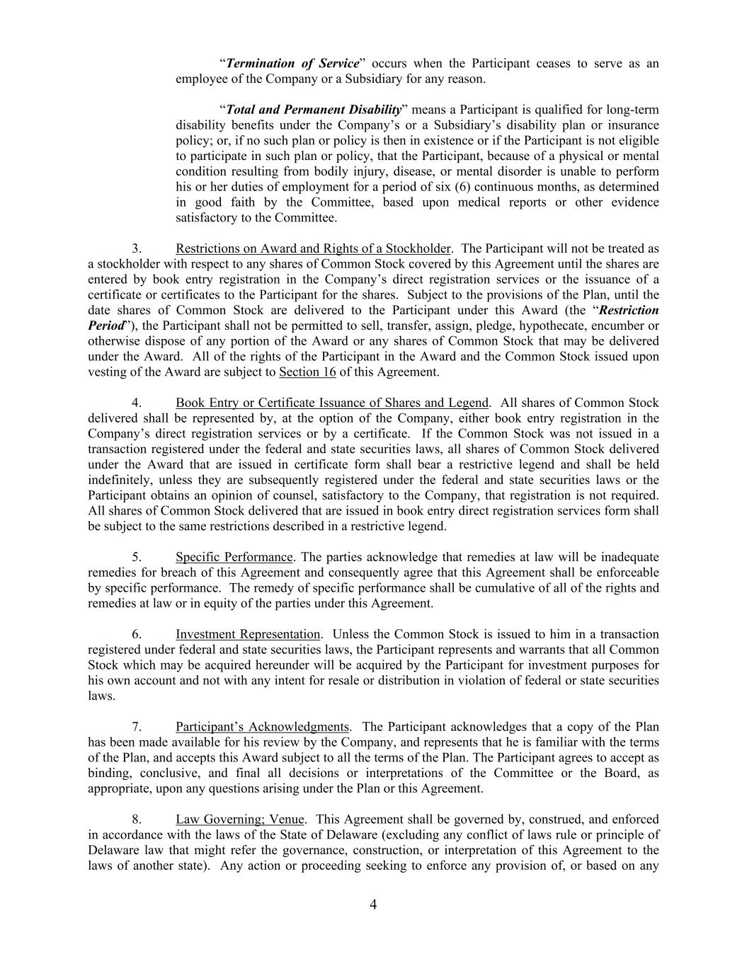 4“终止服务”发生于参与者因任何原因停止担任公司或子公司的员工。“完全和永久残疾”是指参与者有资格根据公司或子公司的残疾计划或保险单获得长期残疾福利;或者,如果当时没有此类计划或政策,或者如果参与者没有资格参与此类计划或政策,则该参与者由于身体伤害、疾病或精神障碍导致的身体或精神状况,无法在委员会善意确定的连续六(6)个月期间内履行其受雇职责,基于医疗报告或委员会满意的其他证据。3.对裁决和股东权利的限制。就本协议涵盖的任何普通股股份而言,参与者将不被视为股东,直至股份在公司的直接登记服务中以簿记登记方式进入或就股份向参与者发行一份或多份证书。根据该计划的规定,在根据本奖励向参与者交付普通股股份之日(“限制期”)之前,参与者不得出售、转让、转让、转让、质押、抵押、设押或以其他方式处置奖励的任何部分或根据奖励可能交付的任何普通股股份。参与者在奖励中的所有权利以及在授予奖励时发行的普通股受本协议第16条的约束。4.簿记建档或发证股份及图例。所有交付的普通股股份应由公司选择在公司直接登记服务中进行簿记登记或通过证书来代表。如果普通股不是在根据联邦和州证券法登记的交易中发行的,则根据裁决交付的以证书形式发行的所有普通股股份应带有限制性图例并应无限期持有,除非它们随后根据联邦和州证券法进行登记或参与者获得公司满意的大律师意见,即无需登记。以簿记直接登记服务形式发行的所有已交付的普通股股份应受到限制性图例中描述的相同限制。5.具体表现。双方承认,法律上的补救措施将是违反本协议的不充分补救措施,因此同意本协议可通过具体履行强制执行。具体履行的补救办法应为本协议项下各方当事人在法律上或权益上的所有权利和补救办法的累加。6.投资代表。除非在根据联邦和州证券法注册的交易中向他发行普通股,否则参与者声明并保证,根据本协议可能获得的所有普通股将由参与者为自己的账户出于投资目的而获得,而不是出于违反联邦或州证券法的任何转售或分配意图。7.与会者致谢。参与者承认该计划的副本已提供给公司供其审查,并表示他熟悉该计划的条款,并在遵守该计划的所有条款的情况下接受此奖励。参与者同意接受委员会或董事会(视情况而定)就计划或本协议下产生的任何问题作出的所有决定或解释,作为具有约束力的、决定性的和最终的。8.治法;会场。本协议应受特拉华州法律管辖、解释和执行(不包括可能将本协议的治理、构建或解释提交给另一州法律的特拉华州法律的任何冲突法律规则或原则)。任何寻求强制执行任何条文的行动或程序,或基于任何