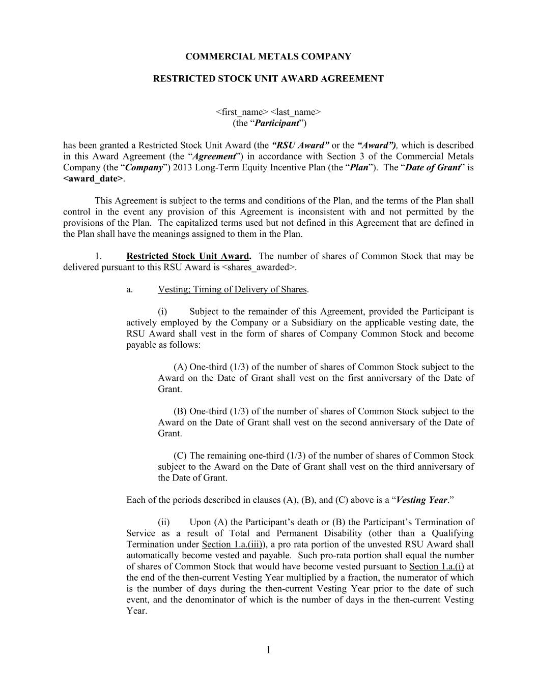 1份商业金属公司限制性股票单位授予协议< first _ name > < last _ name >(“参与者”)已被授予一次限制性股票奖励(“受限制股份单位奖励”或“奖励”),该奖励协议(“协议”)根据《美国工商五金公司公司(“公司”)2013年长期股权激励计划(“计划”)第三节的规定,在本奖励协议(“协议”)中有所描述。“授予日期”为< award _ date >。本协议受计划条款和条件的约束,在本协议的任何条款与计划条款不一致且不被允许的情况下,计划条款应加以控制。本计划中定义的本协议中使用但未定义的大写术语应具有本计划中赋予它们的含义。1.限制性股票奖励。根据本RSU奖励可交付的普通股股份数量为< shares _ awarded >。a.归属;股份交付的时间。(i)在符合本协议剩余条款的情况下,只要参与者在适用的归属日期积极受雇于公司或子公司,受限制股份单位奖励将以公司普通股股份的形式归属,并按以下方式支付:(a)在授予日期受该奖励的普通股股份数量的三分之一(1/3)将在授予日期的一周年归属。(b)授出日期受授予规限的普通股股份数目的三分之一(1/3)须于授出日期的两周年归属。(c)授出日期受授予规限的普通股股份数目的余下三分之一(1/3)须于授出日期的第三个周年归属。上述(a)、(b)和(c)条中所述的每个期间都是“归属年度”。(ii)在(a)参与者死亡或(b)参与者因完全和永久残疾而终止服务(根据第1.a.(iii)条的合资格终止除外)时,未归属的受限制股份单位奖励的按比例部分应自动归属和应付。该按比例部分应等于根据第1.a.(i)条在当时归属年度结束时本应归属的普通股股数乘以一个零头,其分子为该事件发生日期之前的当时归属年度的天数,其分母为当时归属年度的天数。