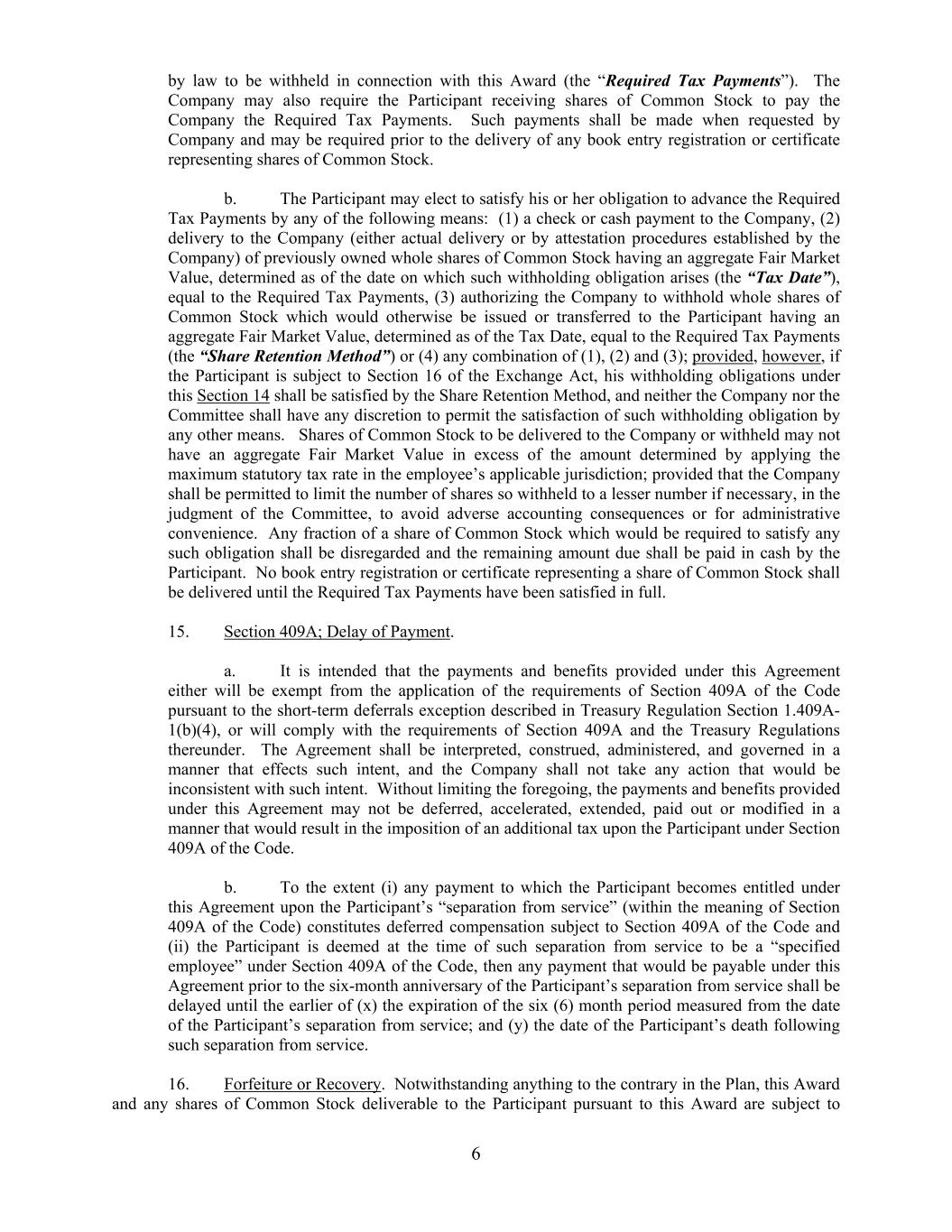 6根据法律规定应就本裁决扣缴的款项(“所需税款”)。公司还可以要求获得普通股股份的参与者向公司支付所需的税款。此类款项应在公司要求时支付,并且可能需要在交付任何代表普通股股份的簿记登记或证书之前支付。b。参与者可选择通过以下任一方式履行其垫付所需税款的义务:(1)向公司支付支票或现金,(2)向公司交付(实际交付或通过公司建立的证明程序)先前拥有的具有合计公平市场价值的普通股的整股股份,该股份在此类预扣义务产生之日(“纳税日”)确定,等于所需税款,(3)授权公司扣留原本会发行或转让给参与者的普通股的全部股份,这些股份的总公允市场价值在纳税日期确定,等于所需的税款(“股份保留法”)或(4)(1)、(2)和(3)的任意组合;但如果参与者受《交易法》第16条的约束,则其在本第14条下的扣缴义务应通过股份保留法来履行,而公司或委员会均无任何酌情权容许以任何其他方式履行该扣缴义务。将交付给公司或代扣代缴的普通股股份的合计公允市场价值不得超过在雇员适用的司法管辖区适用最高法定税率确定的数额;但在必要时,允许公司根据委员会的判断,将如此代扣代缴的股份数量限制在较少的数量,以避免不利的会计后果或为行政便利。将被要求履行任何此类义务的普通股股份的任何零头应不予考虑,剩余的应付款项应由参与者以现金支付。在全额支付所需税款之前,不得交付代表普通股股份的簿记登记或证书。15.第409a款;延迟付款。a。根据《财务条例》第1.409A-1(b)(4)节所述的短期延期例外情况,根据本协议提供的付款和福利要么将免于适用《守则》第409A节的要求,要么将遵守第409A节及其下的《财务条例》的要求。协议应以实现该意图的方式进行解释、解释、管理和管理,公司不得采取与该意图不一致的任何行动。在不限制前述内容的情况下,本协议项下提供的付款和福利不得延期、加速、延期,支付或修改的方式将导致根据《守则》第409A条对参与者征收额外税款。b.在(i)参与者“离职”(在《守则》第409A条的含义内)时,参与者根据本协议有权获得的任何付款构成《守则》第409A条规定的递延补偿,以及(ii)参与者在离职时被视为《守则》第409A条规定的“特定雇员”的情况下,则在参与者离职六个月周年之前根据本协议应支付的任何款项,应延迟至(x)自该参与者离职之日起计算的六(6)个月期限届满之日(以较早者为准);及(y)该参与者在离职后死亡之日(以较早者为准)。16.没收或追回。尽管计划中有任何相反的规定,本奖励及根据本奖励可交付予参与者的任何普通股股份须受