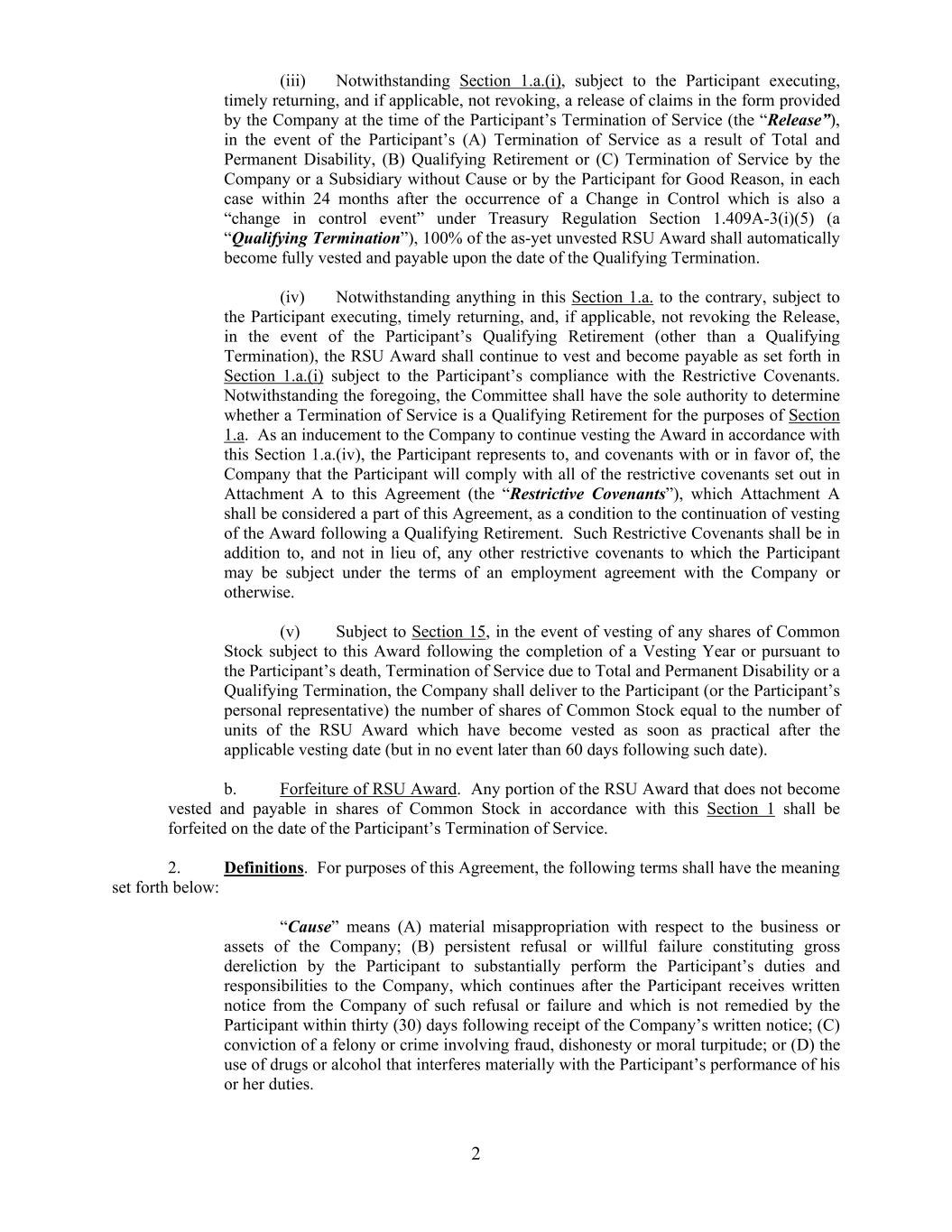 2(iii)尽管有第1.a.(i)条的规定,在参与者执行、及时退回且如适用不是撤销的情况下,以公司在参与者终止服务时提供的表格(“解除”)解除索赔,如果参与者(a)由于完全和永久残疾而终止服务,(b)符合资格退休或(c)公司或子公司无故或参与者有正当理由终止服务,在每一种情况下,控制权变更发生后24个月内,即根据财政部条例第1.409A-3(i)(5)节(“合格终止”),尚未归属的RSU奖励的100%应自动成为全部归属,并在合格终止之日支付。(iv)尽管本条1.a.另有规定。相反,在参与者执行、及时退回,以及(如适用)不撤销释放的情况下,如发生参与者的合资格退休(合资格终止除外),则受限制股份单位奖励须继续归属,并按第1.a.(i)条的规定成为应付款项,但以参与者遵守限制性契诺为限。尽管如此,委员会仍有唯一权力决定终止服务是否为第1.a条所指的合资格退休。作为公司根据本条1.a.(iv)继续归属奖励的诱因,参与者向公司声明并与公司订立有利于或有利于公司的契诺,参与者将遵守本协议附件A所载的所有限制性契诺(“限制性契诺”),附件A应被视为本协议的一部分,作为在合格退休后继续归属奖励的条件。该等限制性契诺应是对参与者根据与公司的雇佣协议条款或其他条款可能受其约束的任何其他限制性契诺的补充,而不是代替。(v)在符合第15条的规定下,如任何受本裁决规限的普通股股份在归属年度结束后归属或依据参与者死亡、因完全永久残疾或合资格终止服务而终止,公司应向参与者(或参与者的个人代表)交付与在适用的归属日期之后(但在任何情况下不得迟于该日期之后的60天)已归属的RSU奖励单位数量相等的普通股股份数量。b.没收RSU奖励。未根据本条第1款以普通股股份归属及应付的受限制股份奖励的任何部分,将于参与者终止服务之日被没收。2.定义。就本协议而言,以下术语应具有下述含义:“原因”是指(a)与公司业务或资产有关的重大挪用;(b)持续拒绝或故意不履行构成参与者对公司的实质性义务和责任的重大失职,这种情况在参与者收到公司关于该拒绝或不履行的书面通知后继续存在,且参与者未在收到公司书面通知后三十(30)天内予以补救;(c)被判犯有涉及欺诈的重罪或犯罪,不诚实或道德败坏;或(d)使用药物或酒精严重干扰参与者履行其职责。