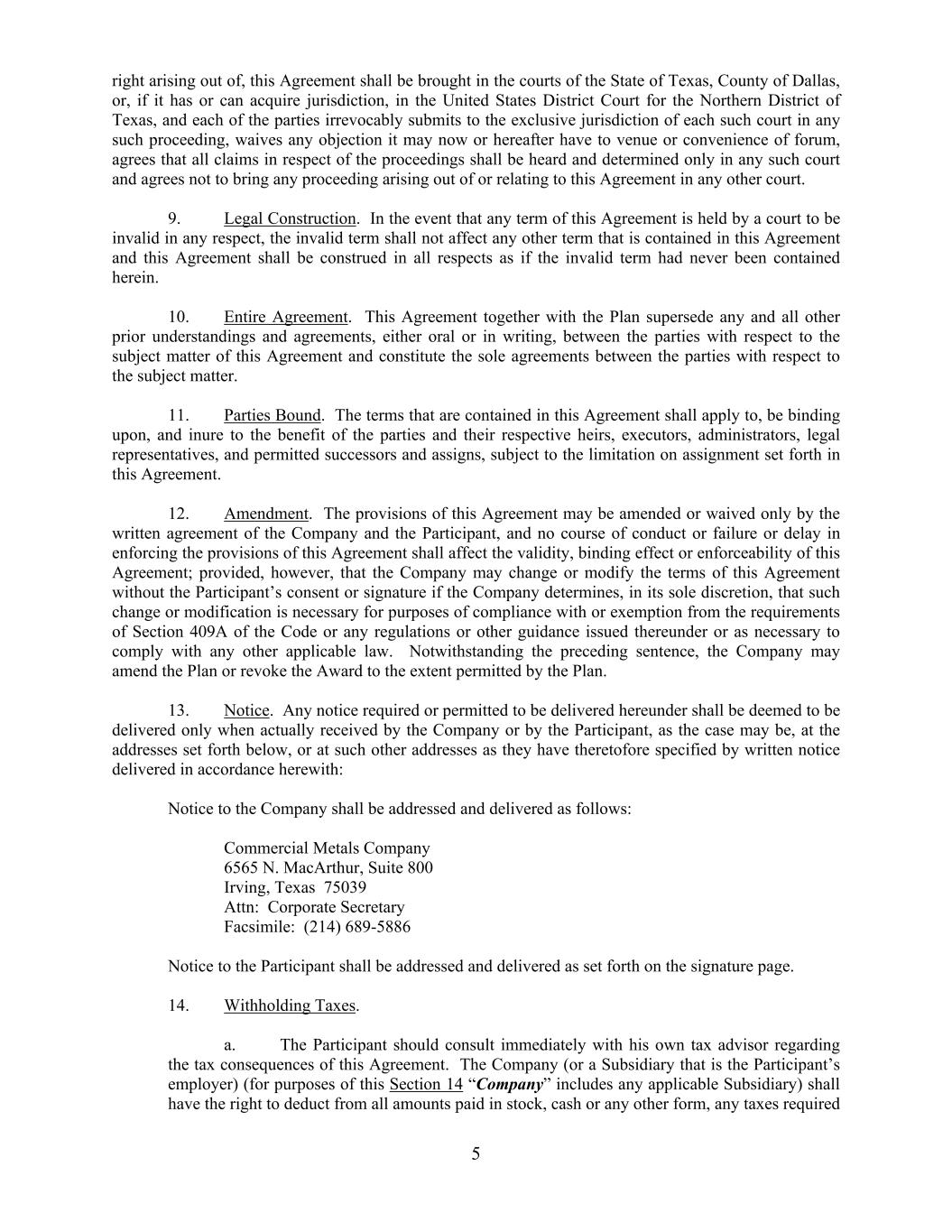 5由此产生的权利,本协议应在德克萨斯州法院、达拉斯县法院提起,或者,如果其拥有或能够获得管辖权,则在美国德克萨斯州北区地方法院提起,且每一方不可撤销地在任何此类程序中向每一该等法院的专属管辖权提交,放弃其现在或以后可能拥有的对诉讼地点或诉讼地便利的任何异议,同意与诉讼程序有关的所有索赔仅在任何此类法院审理和裁定,并同意不在任何其他法院提起因本协议引起或与本协议有关的任何诉讼。9.法律建设。如本协议的任何条款被法院裁定在任何方面无效,则该无效条款不应影响本协议中包含的任何其他条款,本协议应在所有方面被解释为无效条款从未包含在本协议中。10.全部协议。本协议连同本计划取代双方就本协议标的事项达成的任何和所有其他口头或书面事先谅解和协议,并构成双方就标的事项达成的唯一协议。11.各方绑定。本协议所载条款适用于当事人及其各自的继承人、遗嘱执行人、管理人、法定代表人、许可的继承人和受让人,对其具有约束力,并对其有利,但以本协议规定的转让限制为准。12.修正。本协议的条款只能通过公司与参与方的书面协议才能修改或放弃,任何行为过程或执行本协议条款的失败或延迟均不影响本协议的有效性、约束力或可执行性;但前提是,如果公司自行决定,公司可以在未经参与方同意或签署的情况下更改或修改本协议的条款,为遵守或豁免《守则》第409A条或根据该条发布的任何条例或其他指引的要求,或为遵守任何其他适用法律的必要,此种变更或修改是必要的。尽管有前一句,公司可以在计划允许的范围内修改计划或撤销奖励。13.注意。任何根据本协议规定或准许交付的通知,只有在公司或参与者(视情况而定)实际收到下列地址或按照本协议交付的书面通知所指明的其他地址时,方应被视为已交付:致公司的通知的地址和交付方式如下:美国工商五金公司 6565 N. MacArthur,Suite 800 Irving,Texas 75039收件人:公司秘书传真:(214)689-5886致参与者的通知应按签名页规定的地址和交付。14.预扣税款。a。参与者应立即就本协议的税务后果咨询自己的税务顾问。公司(或作为参与者雇主的子公司)(就本第14条而言,“公司”包括任何适用的子公司)有权从以股票、现金或任何其他形式支付的所有金额中扣除所需的任何税款