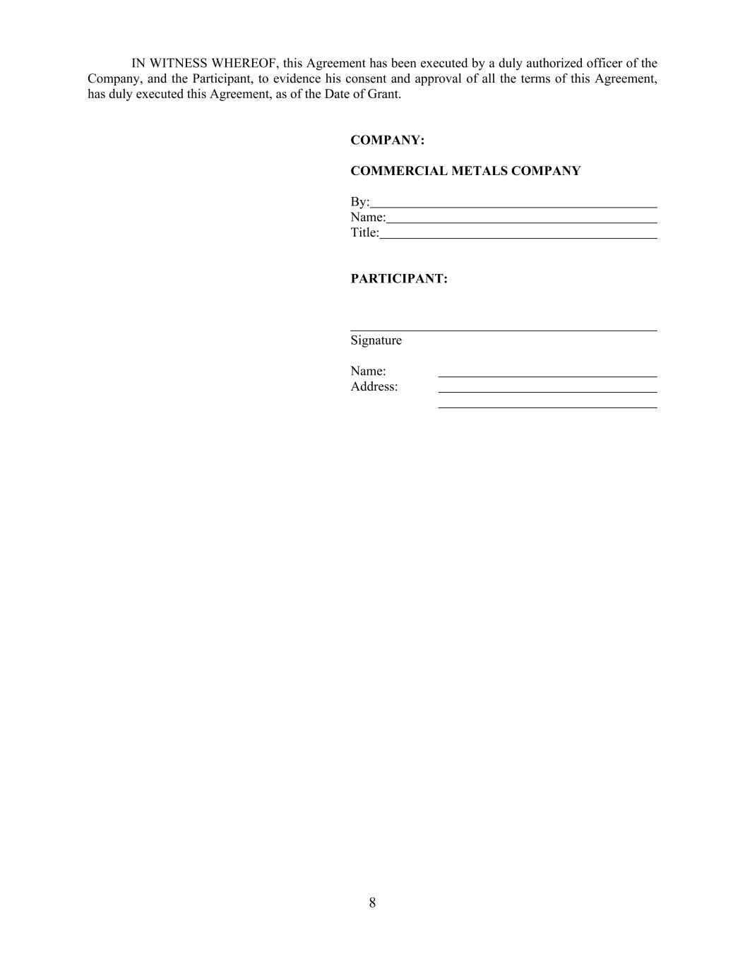 8作为证明,本协议已由公司的正式授权人员签署,而参与者为证明其同意并认可本协议的所有条款,已于授出日期正式签署本协议。公司:商业金属公司由:名称:标题:参与者:签名名称:地址: